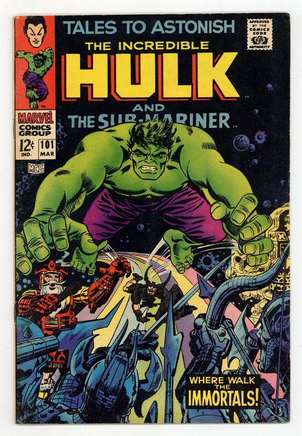 Cover by Marie Severin, Jack Kirby, Frank Giacoia, and Syd Shores. Where Walk the Immortals!, script by Stan Lee, art by Marie Severin and Frank Giacoia; Loki pulls the Hulk to Asgard to fight his father's forces; The Hulk battles the Warriors Three but in a moment of rare clarity, they discover that the jade giant is not really their enemy and refuse Loki's invitation to finish him off; Angered by his failure, Loki casts the Hulk into a bottomless pit. And Evil Shall Beckon, script by Archie Goodwin, art by Gene Colan and Dan Adkins; The Atlanteans abandon the second Atlantis; Namor goes to the Antarctic and finds Destiny hidden below the ice. 36 pgs., full color. The Hulk's solo adventures continue in the pages of Incredible Hulk (1962-1999 1st Series) #102. - Odinson, mycomicshop Archivist. Cover price $0.12.