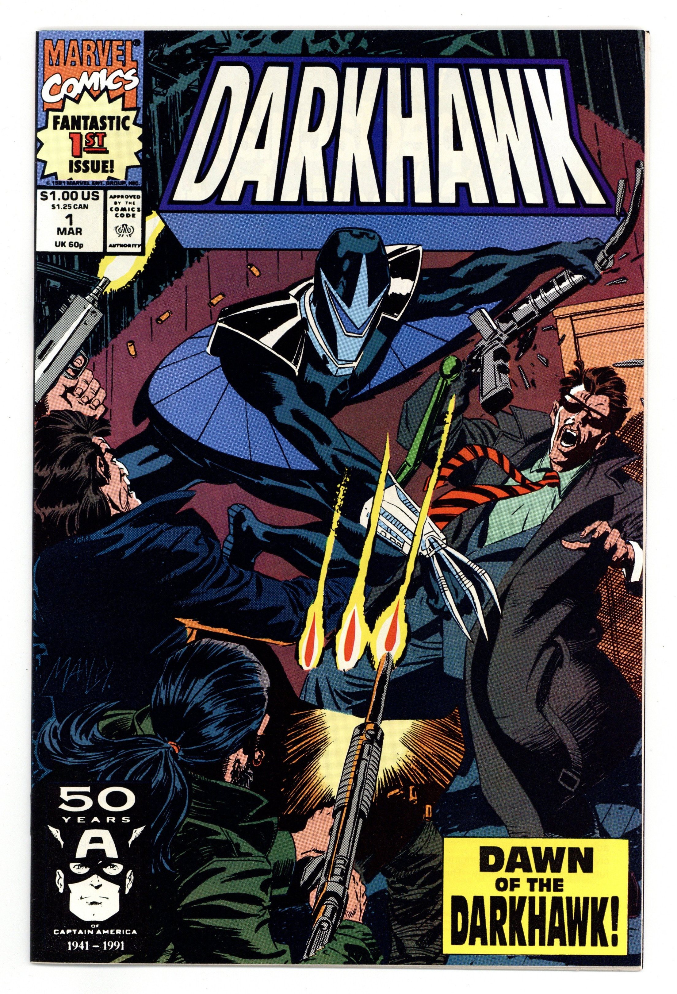 Tags: Marvel Legacy Numbering: Darkhawk (part 1)$24.00Direct Edition. Cover art by Mike Manley. Dawn of the Darkhawk, script by Danny Fingeroth, art by Mike Manley; Chris Powell finds the Darkhawk amulet; Bazin is unable to bribe Chris' mother (an assistant DA), but bribes Chris' father (a cop) who then leaves the family; Bazin and Hobgoblin want the Darkhawk power; Saint Johnny gives Chris the name Darkhawk. 36 pgs. $1.00. Cover price $1.00.