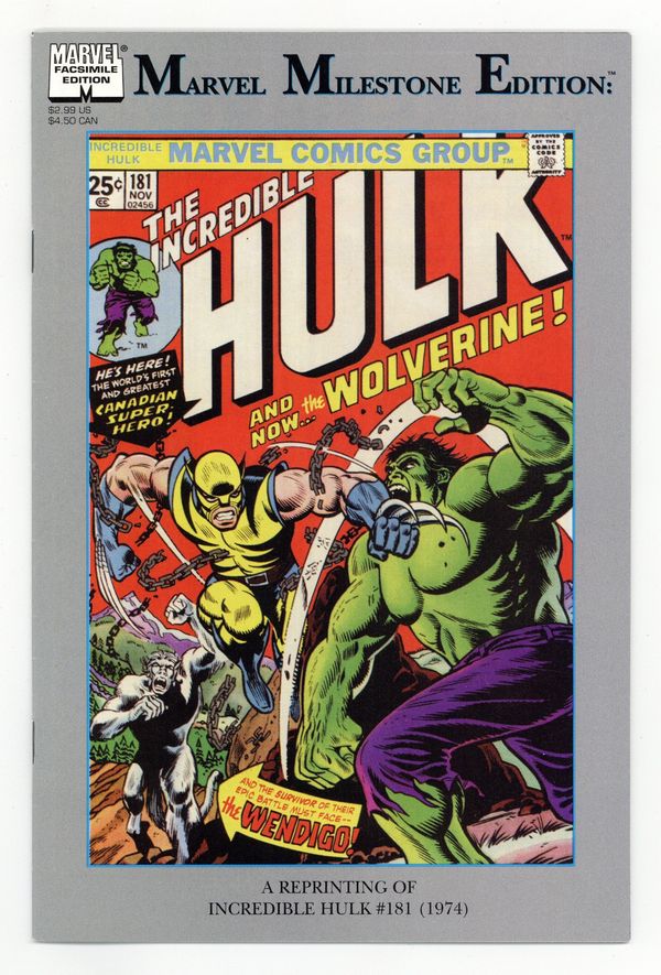 $36.00cover by herb trimpe len wein/herb trimpe/jack abel Presenting Wolverine's 1st adventure! In commemoration of Logan's 25th anniversary, we're reprinting his very first adventure?which happened to be a brawl with the Hulk! This collectors' comic reprints INCREDIBLE HULK #181, in which the Canadian agent calling himself "The Wolverine" jumped into the middle of the battle between the jade giant and Wendigo! Grab a piece of history with this bargain-priced collectors' item! " Cover price $2.99.