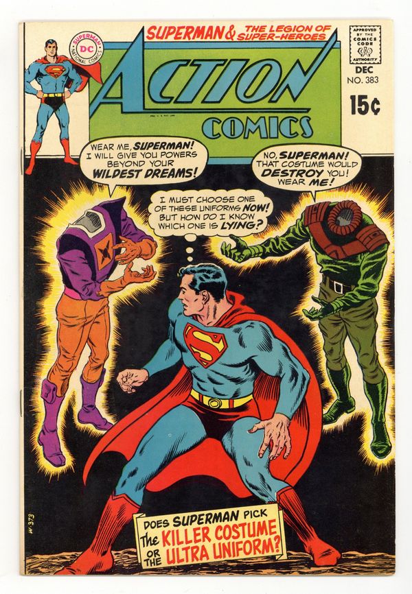 Cover pencils by Curt Swan, inks by Murphy Anderson. "The Killer Costume!", script by Cary Bates, pencils by Curt Swan, inks by George Roussos; Aabur-Z is an interplanetary criminal being transported to prison by Enforcer NS-II; Their ship is destroyed but their costumes remain alive due to their willpower and the strange radiation of a comet; Aabur's costume arrives on Earth first and seeks a criminal to possess, but then both costumes are drawn to Superman. Tales of the Legion of Super-Heroes backup, "Chameleon Boy's Secret Identity!", script by E. Nelson Bridwell, pencils by Win Mortimer, inks by Jack Abel; Chameleon Boy escorts Princess Projectra to a party and meets her friend Janice; Since Janice is repelled by Chameleon Boy's appearance, he disguises himself as Dane to get to know her; Appearances by Chameleon Boy, Princess Projectra, and Karate Kid. Warden Willis 1-page gag by Henry Boltinoff. Superman ad. 36 Pages, Full Color. $0.15 Cover price $0.15.