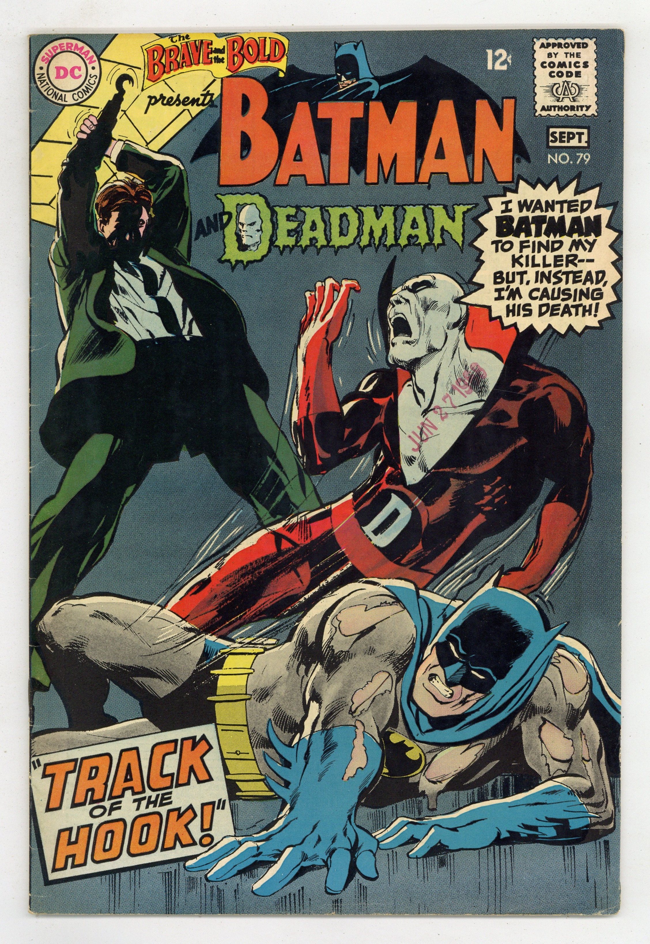 Cover by Neal Adams. "The Track of the Hook," script by Bob Haney, art by Neal Adams; While aiding Commissioner Gordon in solving the murder of small time crook Whitey Marsh, Batman learns that the killer was wearing a hook; Deadman, having come to Gotham City to seek Batman's aid in finding his killer, believes the villain responsible, the Hook is in Gotham after overhearing the eye witness account of Marsh's murder; Aiding Batman the two learn that the killer was not the man who Deadman is looking for, but a thug working for Kubla Kaine, a wealthy business man who is running for mayor and is secretly running a crime syndicate out of Gotham City. 36 Pages, Full Color. Cover price $0.12.
