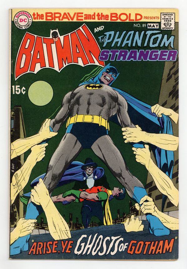 Cover by Neal Adams. "Arise Ye Ghosts of Gotham," script by Bob Haney, pencils by Ross Andru, inks by Mike Esposito; Gotham City is visited by a religious group called the Hellerites, a group of people who centuries ago owned the land that later became known as Gotham City; The forefathers of Gotham had forced the Hellerties off the land, and now they have returned with their apparent messiah and founder Josiah Heller was prophesied to come back and threaten to turn Gotham City into a desert unless the land was turned over to his people; Batman and the Phantom Stranger to join forces to learn the truth behind Josiah's apparent supernatural powers. Statement of ownership - average print run 448,000; average paid circulation 242,000. Also features a one-page text article titled "The Greatest Heroes of Them All," the third in a series recounting the heroes who previously appeared in Brave and Bold. This article covers the appearances of the Martian Manhunter, Flash, and various heroes who appeared in issues without Batman. 36 Pages, Full Color. Cover price $0.15.