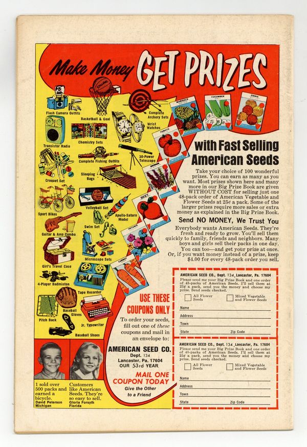 Tags: Batman$25.00Cover pencils by Neal Adams, inks by Dick Giordano. "A Vow from the Grave!," script by Denny O'Neil, pencils by Neal Adams, inks by Dick Giordano; Batman captures Kano Wiggins and also helps solve the murder of a circus side-show performer. "Battle of the Three M's," script by Frank Robbins, pencils by Don Heck, inks by Dick Giordano; When a popular fashion model Mamie Acheson is injured and has to select one of three models (Maxi, Midi or Midi) to act as her replacement while her leg heals, it causes quite a stir in the fashion world; Batgirl soon finds herself involved after a suspicious visit from a member of a fashion company to her library seeking to get certain books. Letter to the editor from comics writer Martin Pasko. 36 pgs., full color. $0.15. Cover price $0.15.