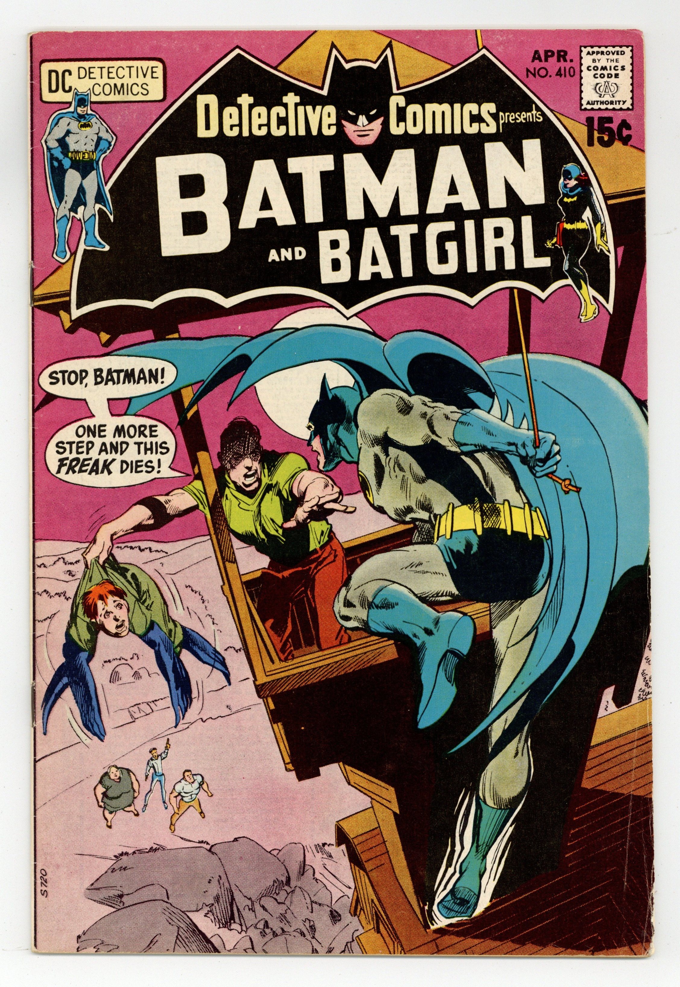 Cover pencils by Neal Adams, inks by Dick Giordano. "A Vow from the Grave!," script by Denny O'Neil, pencils by Neal Adams, inks by Dick Giordano; Batman captures Kano Wiggins and also helps solve the murder of a circus side-show performer. "Battle of the Three M's," script by Frank Robbins, pencils by Don Heck, inks by Dick Giordano; When a popular fashion model Mamie Acheson is injured and has to select one of three models (Maxi, Midi or Midi) to act as her replacement while her leg heals, it causes quite a stir in the fashion world; Batgirl soon finds herself involved after a suspicious visit from a member of a fashion company to her library seeking to get certain books. Letter to the editor from comics writer Martin Pasko. 36 pgs., full color. $0.15. Cover price $0.15.