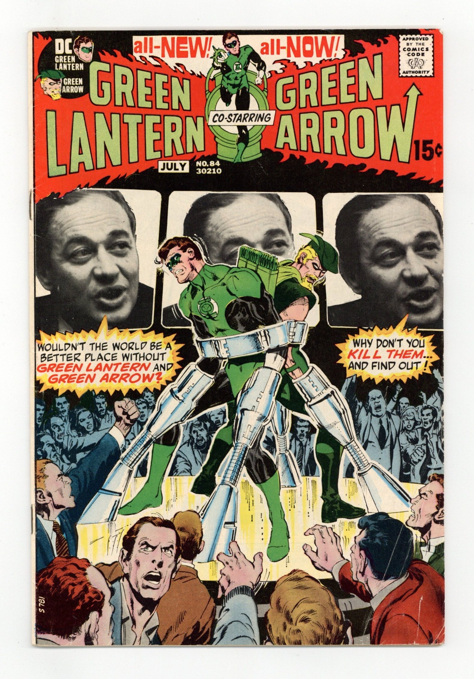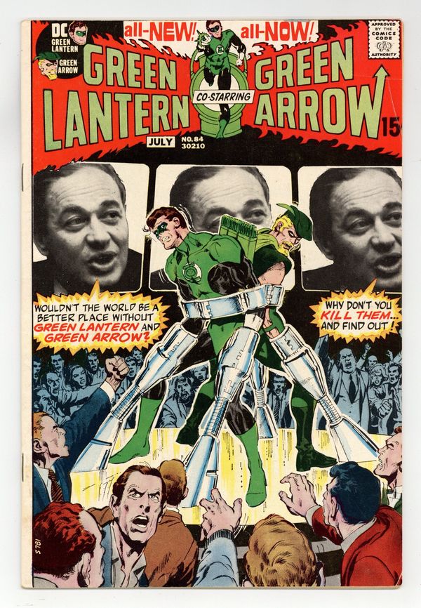 Final 15-cent cover price. Cover art by Neal Adams. Peril in Plastic, script by Denny O'Neil, pencils by Neal Adams, inks by Bernie Wrightson; While Carol Ferris is in Piper's Dell, the sea wall protecting the town begins to give way, so Hal responds as Green Lantern; After saving the town, GL is given a tour of the plastic factory; Weakened by gas emitted by the plastic pins produced there, he is unable to fight back, so he sends his ring to Green Arrow; When he revives, he finds that his old enemy Black Hand uses the pins to keep the community under his control; He sends GL and Carol out into the streets to face the wrath of the townspeople, but Green Arrow arrives in time with GL's ring, and GL traps Black Hand in his own plastic. This issue features the memorable "Ka-loooota" sequence (a reference to artist Michael Kaluta). Cover price $0.15.