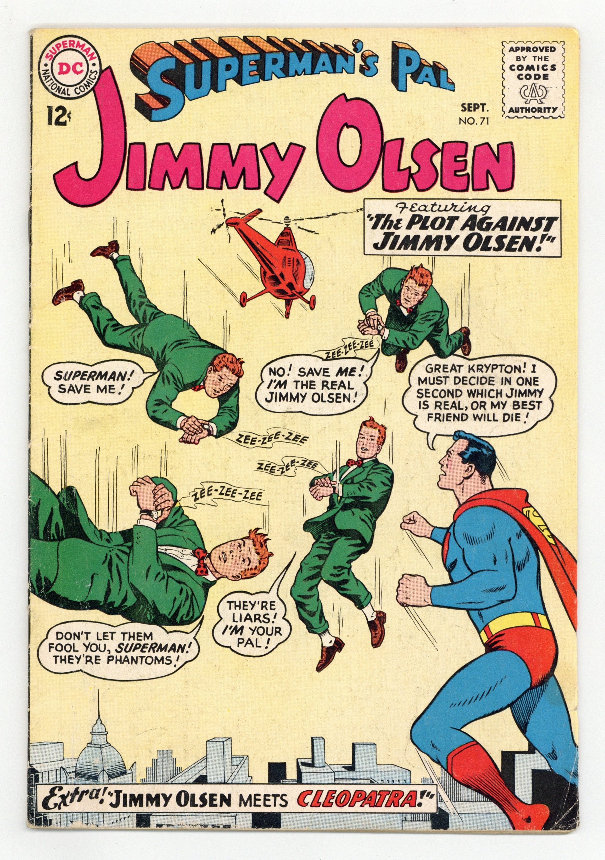 Cover pencils by Curt Swan, inks by George Klein. The Plot Against Olsen!, pencils by Curt Swan, inks by George Klein; Olsen inadvertently spoils one of Mr. Mzyzptlk's pranks, the imp from the fifth dimension gets his revenge by creating three exact duplicates of the cub reporter which cause multiple problems for Jimmy. Jimmy Olsen Meets Cleopatra!, pencils by Curt Swan, inks by George Klein; Jimmy and Professor Potter appear to travel back through time to Ancient Egyptian times. The Nine Lives of Jimmy Olsen!, script by Edmond Hamilton, art by John Forte. 36 Pages, Full Color. Cover price $0.12.