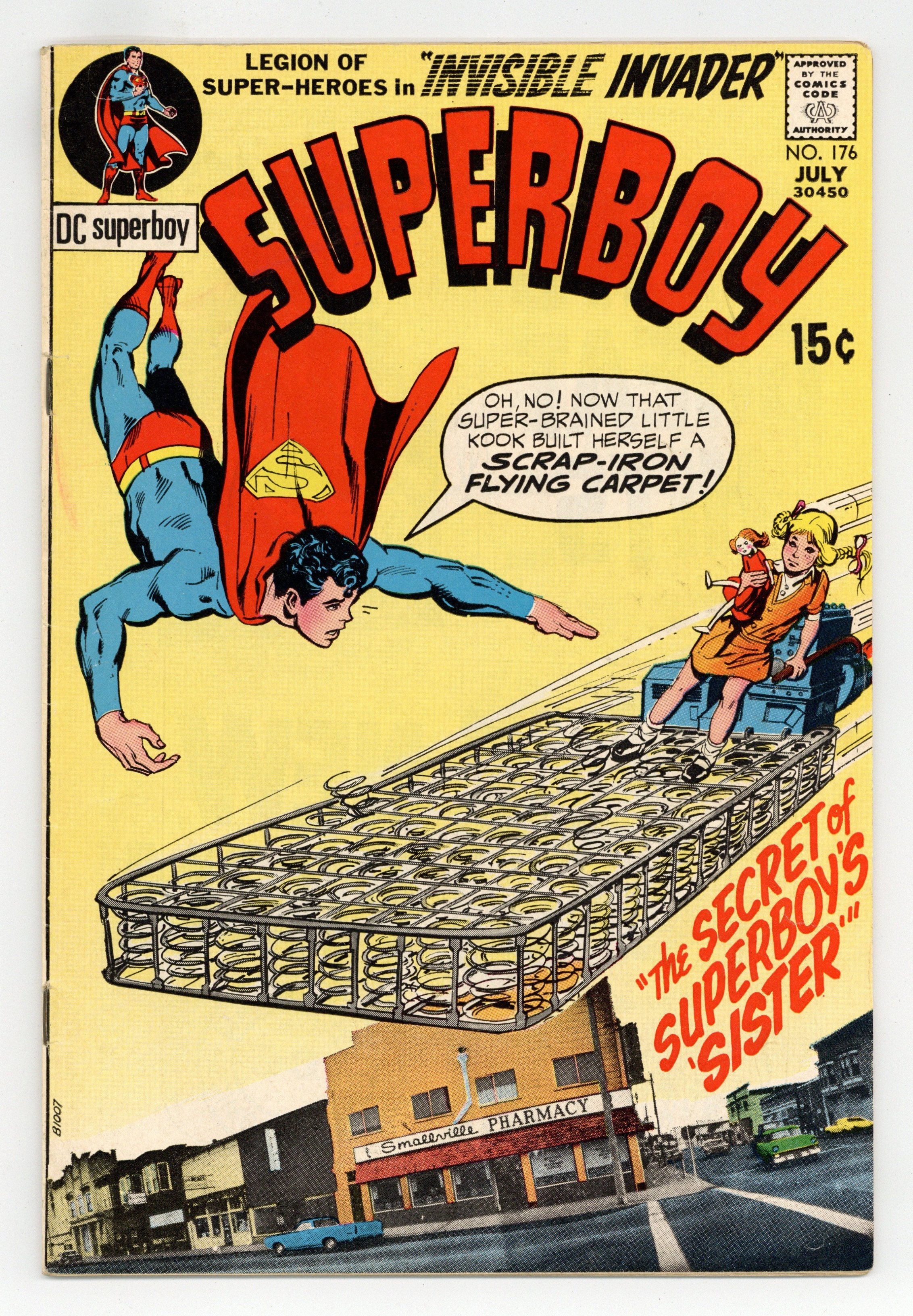 Tags: Superman$11.50Cover art by Neal Adams, part photo. The Secret of Superboy's Sister, script by Leo Dorfman, pencils by Bob Brown, inks by Murphy Anderson; young Kathy Warren stays with the Kent family while her mother recuperates from a car accident. Invisible Invader!, script by E. Nelson Bridwell, art by George Tuska; Chemical King and Invisible Kid have to work together to thwart a criminal who has duplicated Invisible Kid's invisibility serum. Cary Bates autobiography. 36 Pages, Full Color. Cover price $0.15.