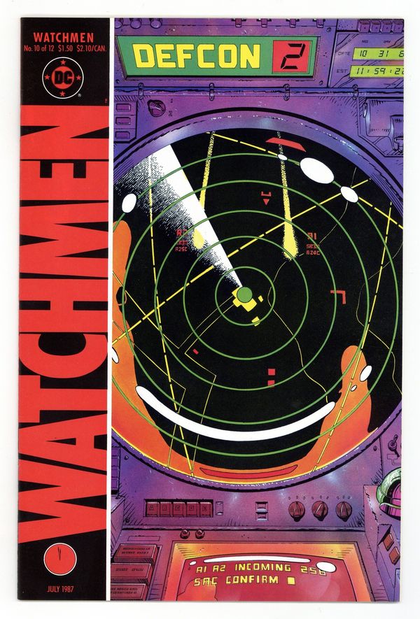$22.50"Two riders were approaching". Part 10 of 12. Story by Alan Moore. Art and cover by Dave Gibbons. Rorschach and Night Owl continue their detective work and finally discover who is behind the conspiracy. This is not a good thing. Includes four page fictional text feature with a view of Adrian Veidt's scrapbook. 32 pages. Full color. No ads. Cover price $1.50.