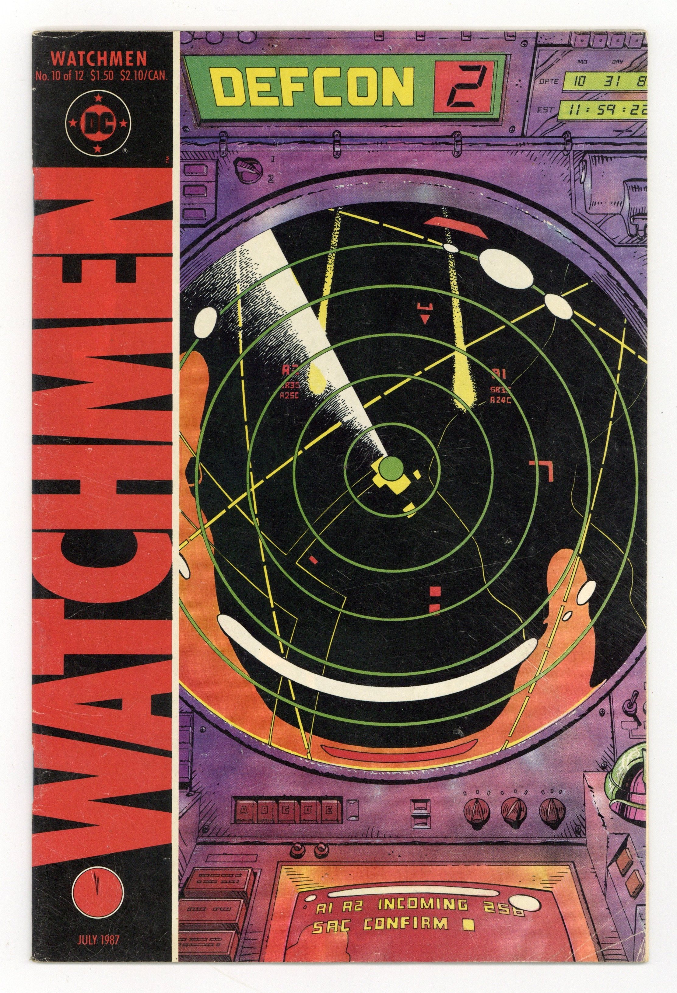 $35.00"Two riders were approaching". Part 10 of 12. Story by Alan Moore. Art and cover by Dave Gibbons. Rorschach and Night Owl continue their detective work and finally discover who is behind the conspiracy. This is not a good thing. Includes four page fictional text feature with a view of Adrian Veidt's scrapbook. 32 pages. Full color. No ads. Cover price $1.50.