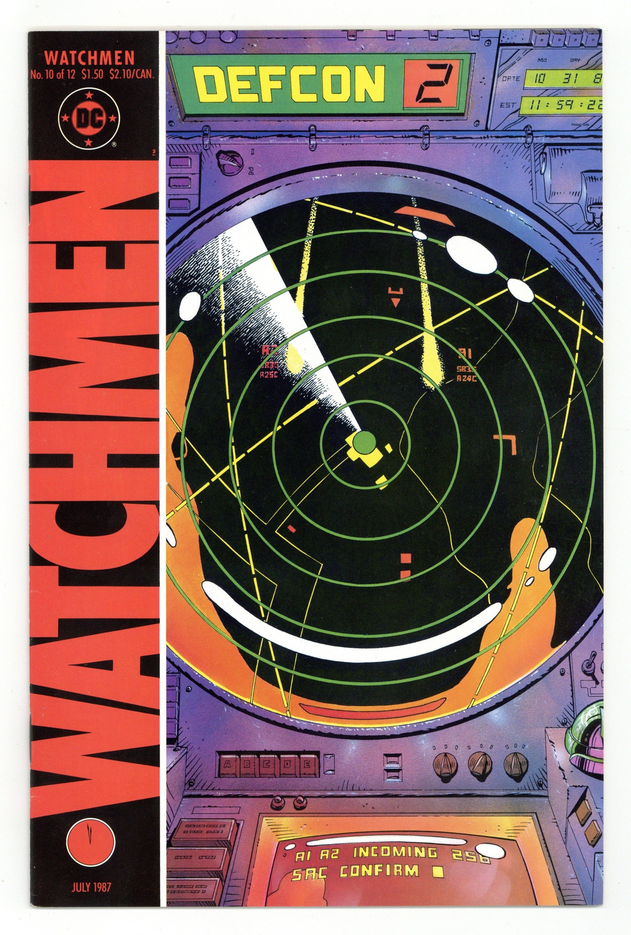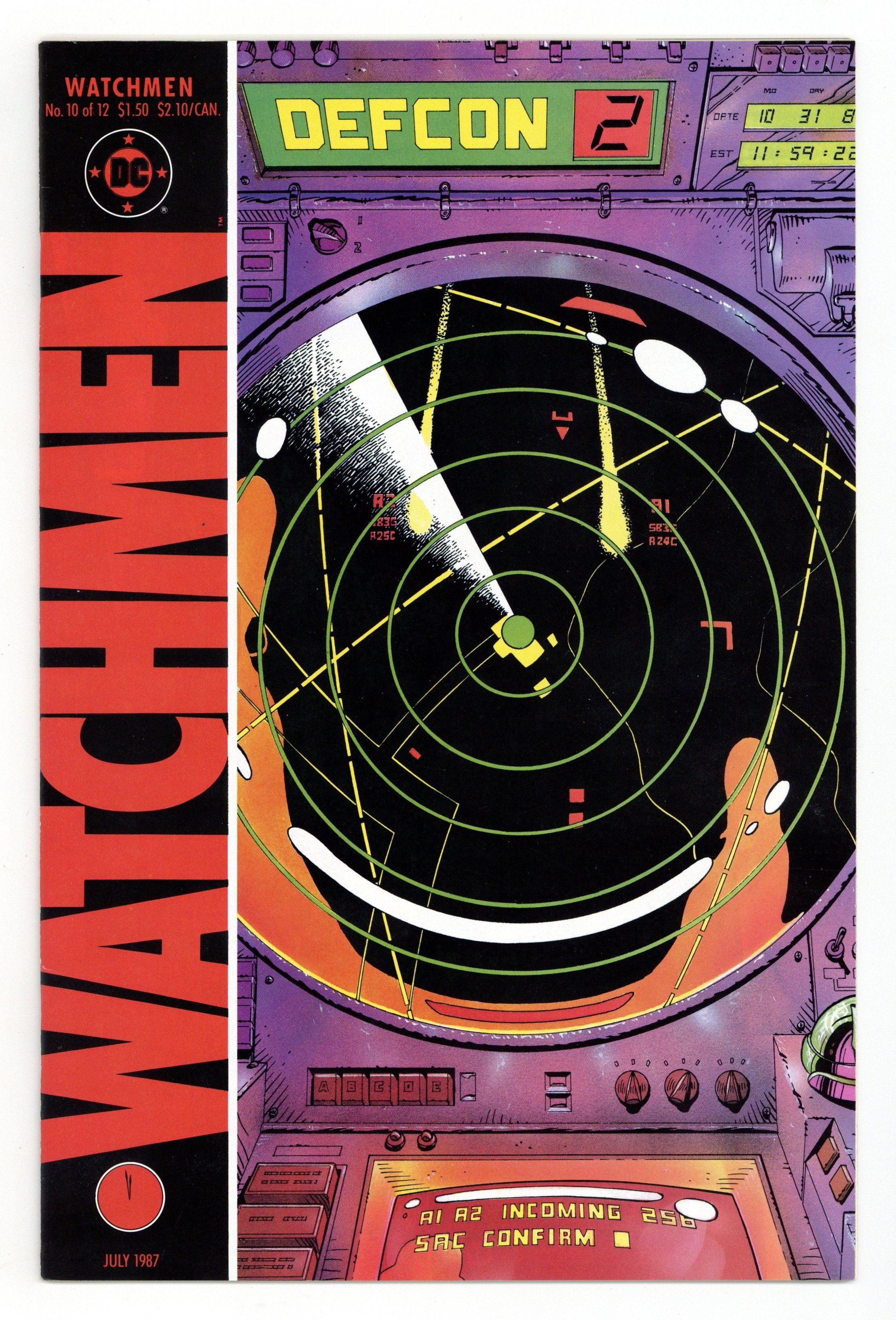"Two riders were approaching". Part 10 of 12. Story by Alan Moore. Art and cover by Dave Gibbons. Rorschach and Night Owl continue their detective work and finally discover who is behind the conspiracy. This is not a good thing. Includes four page fictional text feature with a view of Adrian Veidt's scrapbook. 32 pages. Full color. No ads. Cover price $1.50.