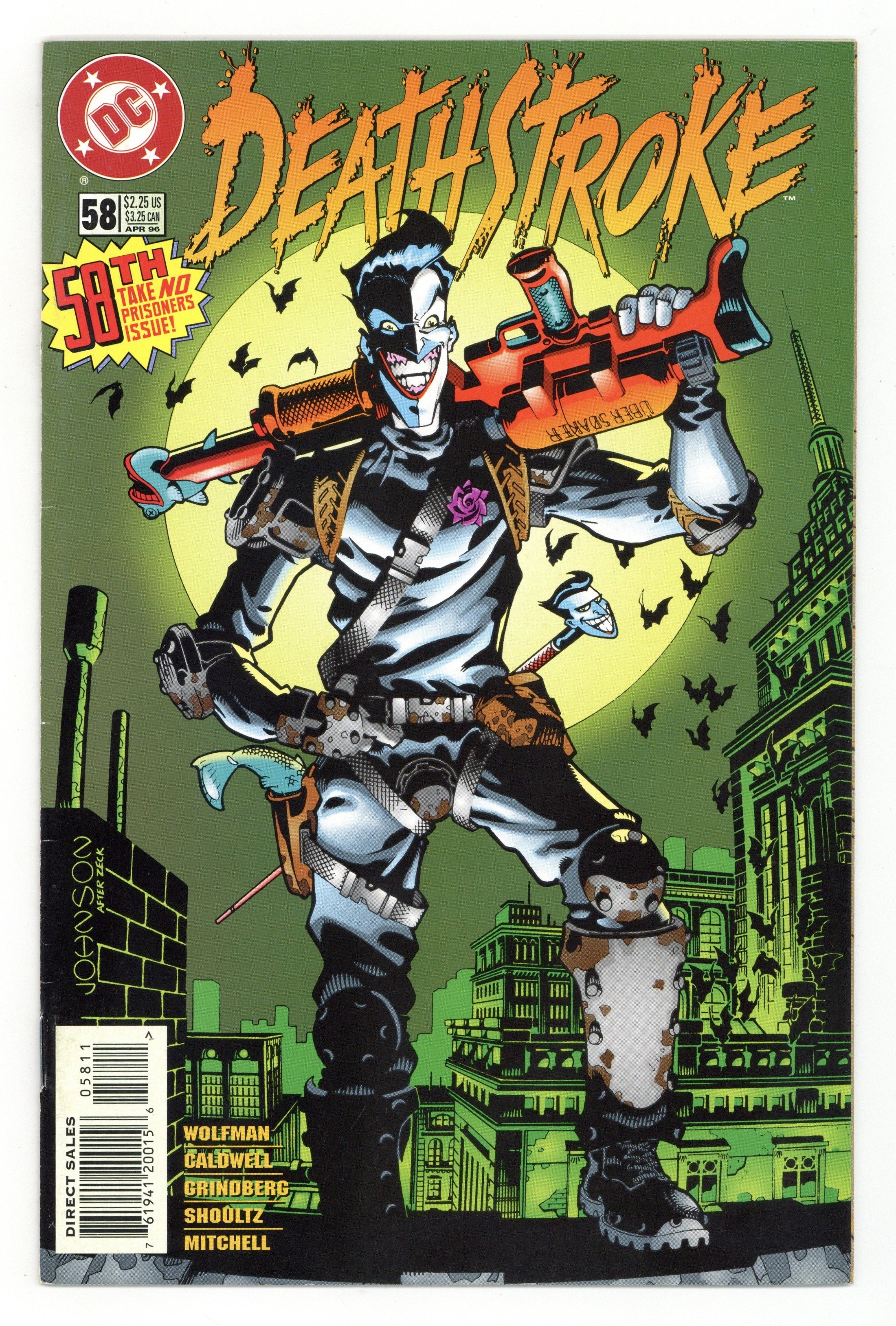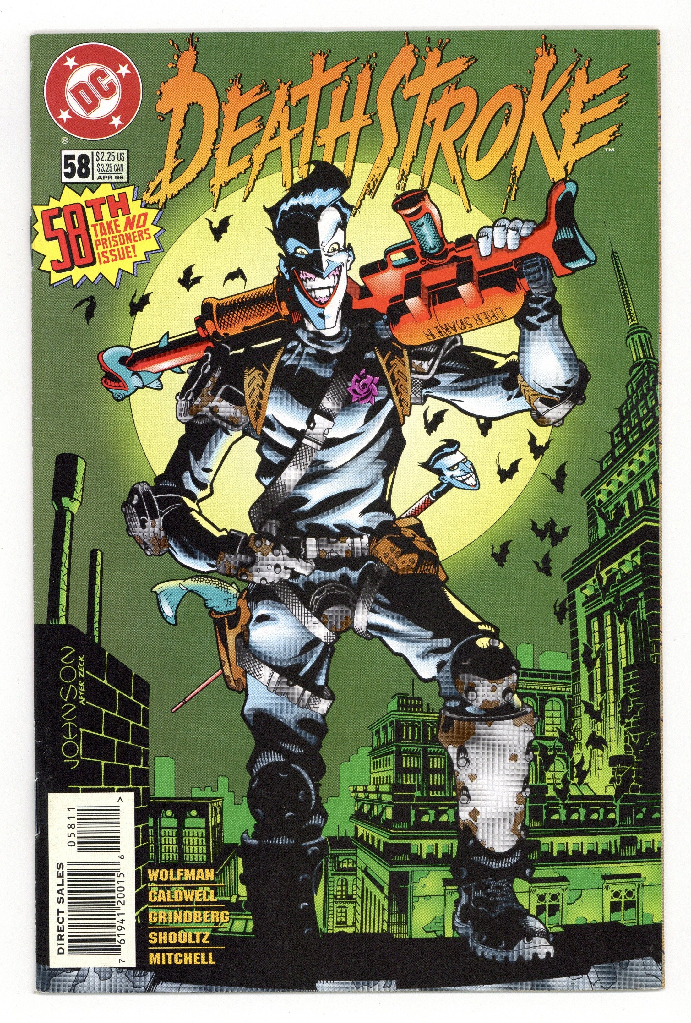 Bad Blood - Written by Marv Wolfman. Art by Alan Caldwell, Tom Grindberg, Curt Shoultz and Steve Mitchell. Cover by Dave Johnson (an homage to the cover of issue #1). In order to save the lives of an entire city, Deathstroke must somehow stop Batman's greatest adversary -- the Joker! It's the Terminator vs. the Clown Prince of Crime. 'Nuff said! Characters in this issue: Deathstroke [Slade Wilson]; W.R. Wintergreen; Pat Trayce [Vigilante]; Mayor Carl W. Bennett; Janey Bennett; Mrs. Bennett; Bobby; Joker; Joseph. 32 pages, full color. Cover price $2.25.