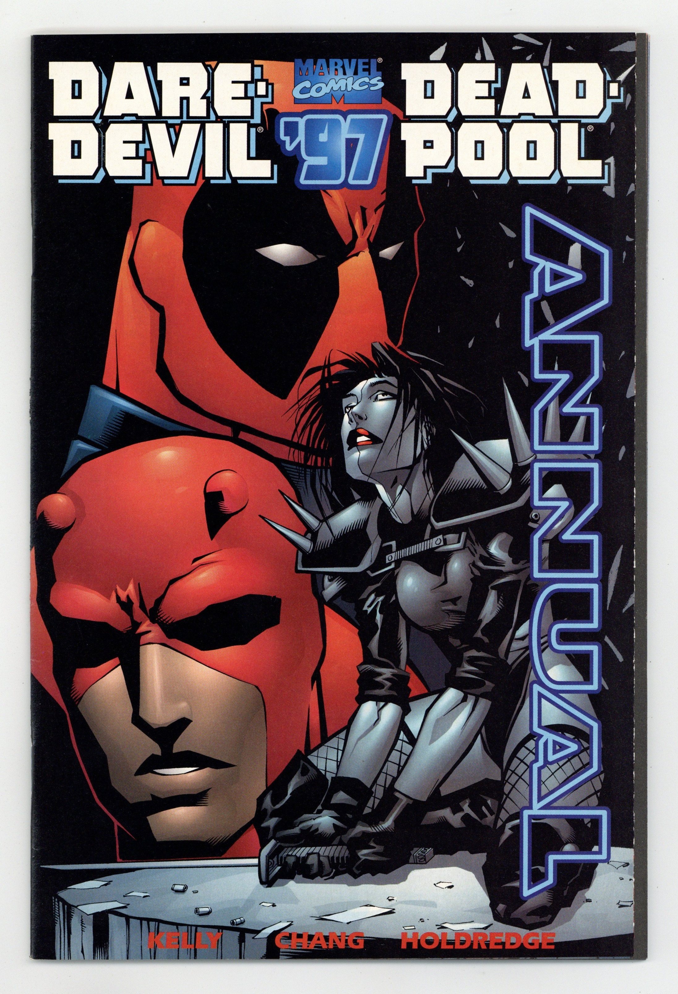 "Whomsoever Fights Monsters..." Written by Joe Kelly. Pencils by Bernard Chang. Inks by Jon Holdredge. Typhoid Mary, that schizoid sweetie from Daredevil's past, returns to her old stomping grounds to exact revenge on everyone who's ever screwed her over, including DD! Now Deadpool's on her tail, but whose side is he on? And you must not miss the subplot featuring the most popular supporting cast member of them all, Deuce the Devil Dog! Cover price $2.99.