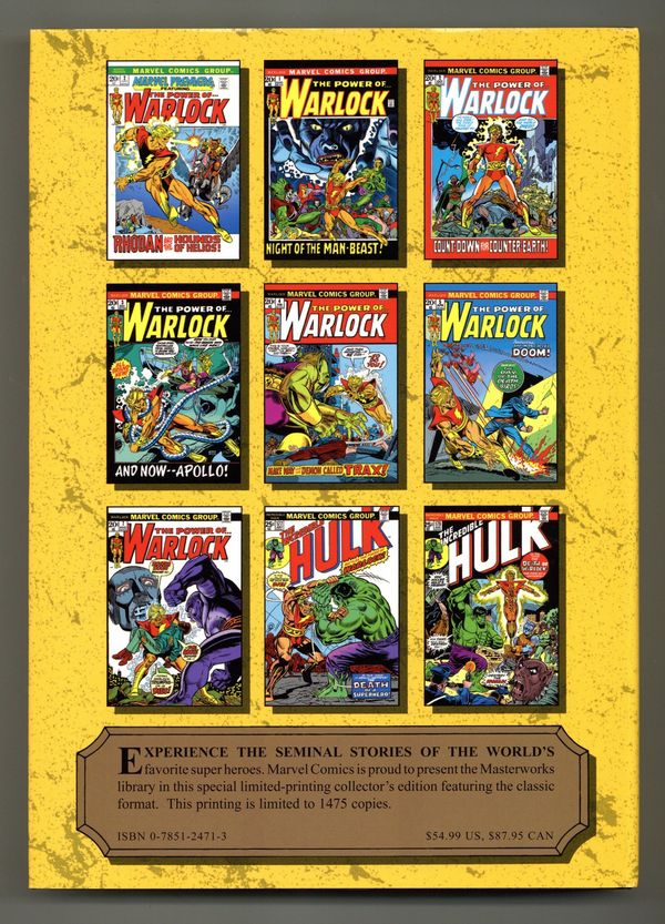 Volume 72 - 1st printing. "Adam Warlock" Collects Marvel Premiere (1972) #1-2, Warlock (1972-76 Marvel 1st Series) #1-8, and Incredible Hulk (1962-1999 1st series) #176-178. Written by ROY THOMAS, MIKE FRIEDRICH, RON GOULART, GERRY CONWAY, and TONY ISABELLA. Art by GIL KANE, JOHN BUSCEMA, TOM SUTTON, BOB BROWN, and HERB TRIMPE. Cover by GIL KANE. Introduction by Roy Thomas. As the 1970s dawned, Marvel Comics marched into a new era. An era whose heroes increasingly reflected the turmoil and social unrest of the time. And as Marvel's heroic pantheon evolved, a newly christened hero debuted to herald that new era: Adam Warlock! Mixing super-hero action with equal parts social consciousness and allegory, writer Roy Thomas and artist Gil Kane, in some of the most accomplished work of his career, launched Warlock on a wild ride across the cosmos to Counter-Earth! Hastened by the High Evolutionary to be the savior of this parallel planet, Warlock, armed for the first time with his soul gem, must do battle with the evil Man-Beast for the very planet itself! Featuring guest-appearances by Dr. Doom, Reed Richards and Incredible Hulk, this volume of never-before-collected stories is one you won't want to miss, and you can bet your pet rock on that! Hardcover, 288 pages, full color. NOTE: Limited to 1470 copies. Cover price $54.99.