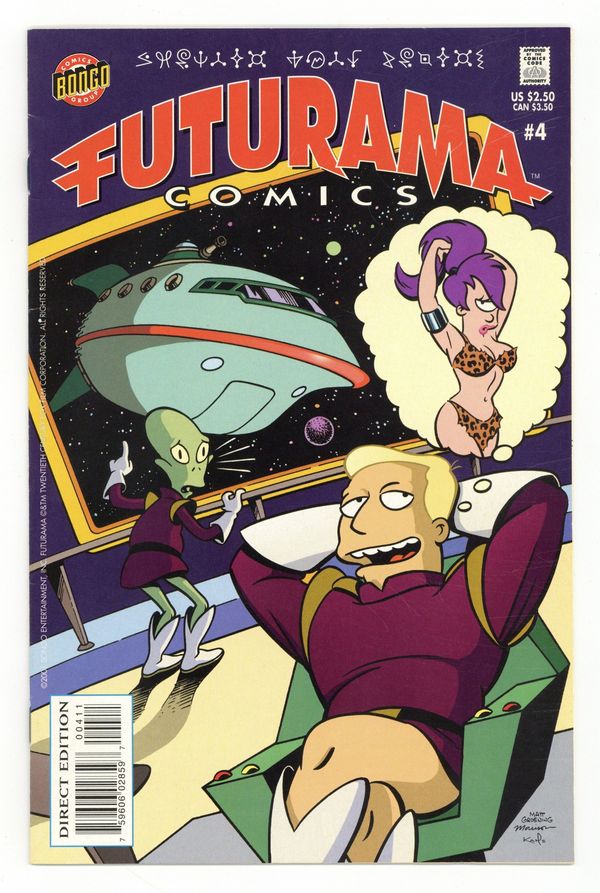 $17.00by Rogers, Cooke, & Morrison Zapp Brannigan disappears into the jungles of a distant planet, where he is made ruler and worshipped as a god! He sends only one message from the bush... the king needs a one-eyed jungle queen! The Democratic Order of Planets (DOOP) sends a reluctant Leela, Kif Kroker, Fry, and Bender up river into the heart of darkness to save him ? but they are not prepared for the unspeakably bloated horror they find there! FC, 32pg Cover price $2.50.