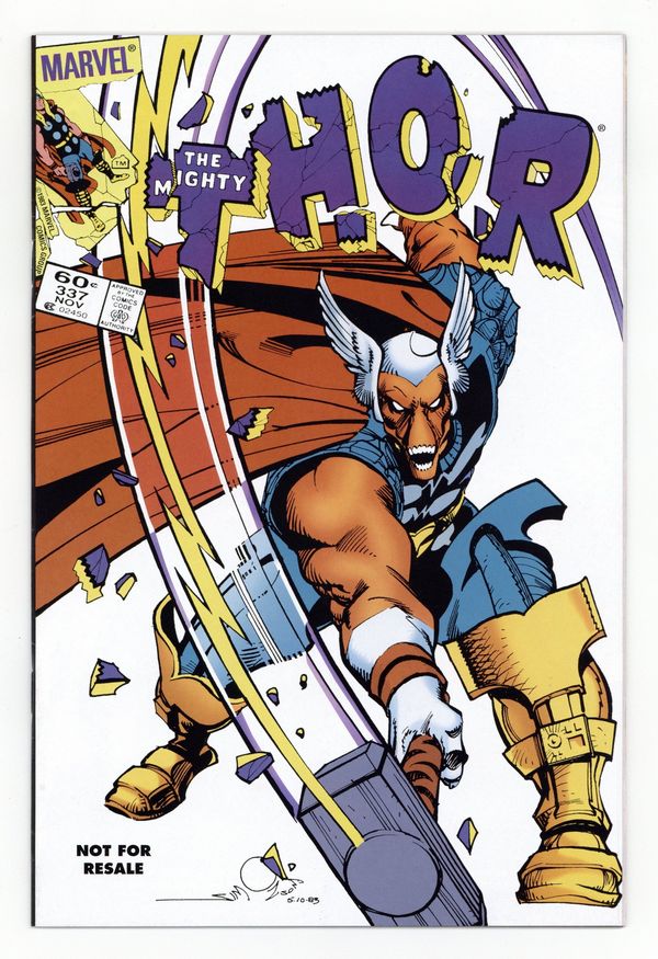 2006 reprint edition that originally came packaged with Beta Ray Bill from Marvel Legends series 15 (Modok Series). Beta Ray Bill (first appearance) becomes Thor in "Doom!" Script, art, and cover by Walt Simonson. Brief appearances by Nick Fury, Loki, Sif, Balder, Heimdall, Volstagg, and Odin. First appearance of Lorelei (sister of the Enchantress). Cover price $0.60.