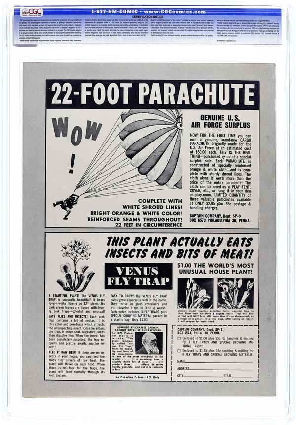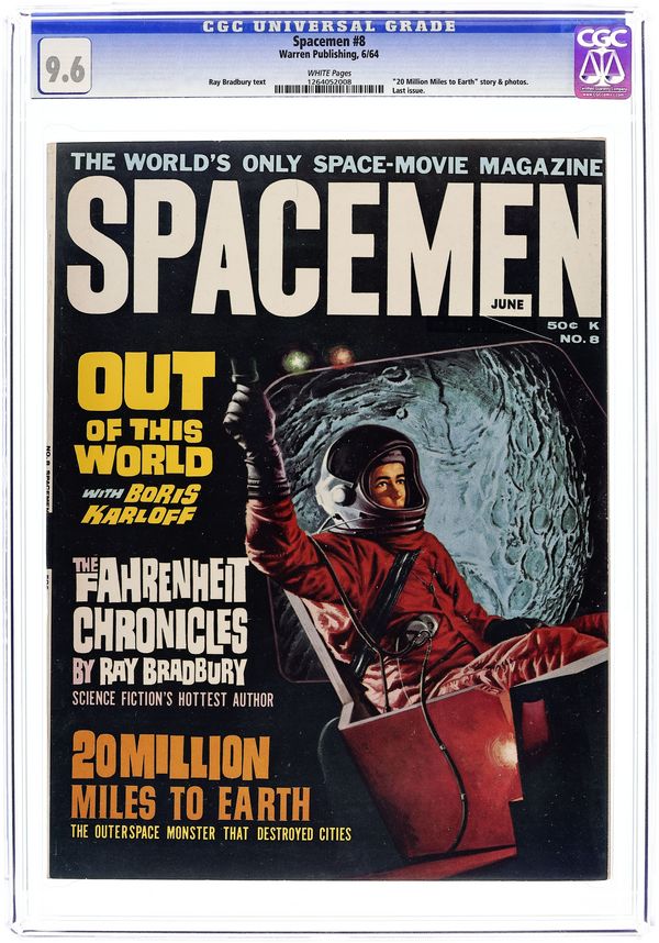 Cover by Basil Gogos. Stories and art by Forrest J. Ackerman and Ray Bradbury. A science fiction-themed spin-off of Famous Monsters of Filmland from the same editor-publisher team, Forrest J. Ackerman and James Warren. Part Three of Forrest Ackerman's examination of Fritz Lang's silent science fiction classic Metropolis. A novelization of the 1957 Ray Harryhausen classic 20 Million Miles to Earth. Science fiction author Ray Bradbury discusses the state of sci-fi film in the early '60s. Plus vintage ads for science and science-fiction products, including a "Genuine Official U.S. Government Surplus Space Suit." Space Screen; 20 Million Miles to Earth; Spacemen of Distinction; Most of the Cosmos; King of the Rocketmen; The Super Space; Orbitruary Dept.; Metropolis; The Fahrenheit Chronicles. Final issue of the series. 8 1/2-in. x 11-in., 64 pages, B&W. Cover price $0.50.