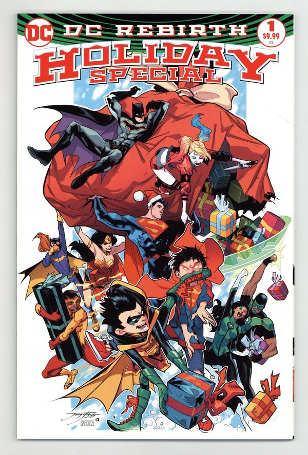 Tags: DC Universe Rebirth$17.50Written by Paul Dini, Tim Seeley, Eric Esquivel, Heath Corson & Gustavo Duarte, Mariko Tamaki, James Tynion IV, Gene Len Yang, K. Perkins, James Asmus and Steve Orlando & Vita Ayala. Art by Elsa Charretier, Ian Churchill, Dan Jurgens & Norm Rapmund, Gustavo Duarte, Maatias Bergara, Robbi Rodriguez, Andrea Mutti, Paolo Pantalena, Reilly Brown and V. Ken Marion. Cover by Jorge Jimenez. DC's biggest and brightest heroes celebrate the holidays in this new special! Don't miss a Chanukah crisis for Huntress, a Flash family Christmas, Wonder Woman interrupting John Constantine's hellblazing pagan party and more-including the return of Detective Chimp! Today's top talents bring you a very special holiday gift that'll keep on giving through the New Year! And writer Paul Dini crafts a Harley holiday tale featuring DCU guests that bridges all the stories in the weirdest, wildest way. 96 pages, full color. Rated T Cover price $9.99.