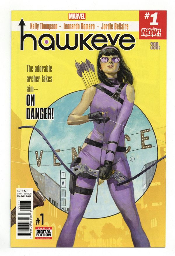 Ends Dec 8 8:33 PM CST Bid History 5 bids Current Bid $20 Your Secret Max Bid If you'd like to bid, please log in or register. Written by Kelly Thompson. Art by Leonardo Romero. Cover by Julian Totino Tedesco. Remember Hawkeye? No not that Hawkeye, our favorite Hawkeye, the chick who puts the hawk in Hawkeye, the butt-kicking hero who had to save the other Hawkeye's butt all the time. Yup, you know her, it's the dazzling Kate Bishop making her solo comics debut! Kate is heading west and returning to Los Angeles, with her bow and arrow and P.I. badge in tow. There are crimes to solve and she's the best archer to handle 'em! The City of Angels has a new guardian angel. 28 pages, full color. Rated T+ Cover price $3.99.