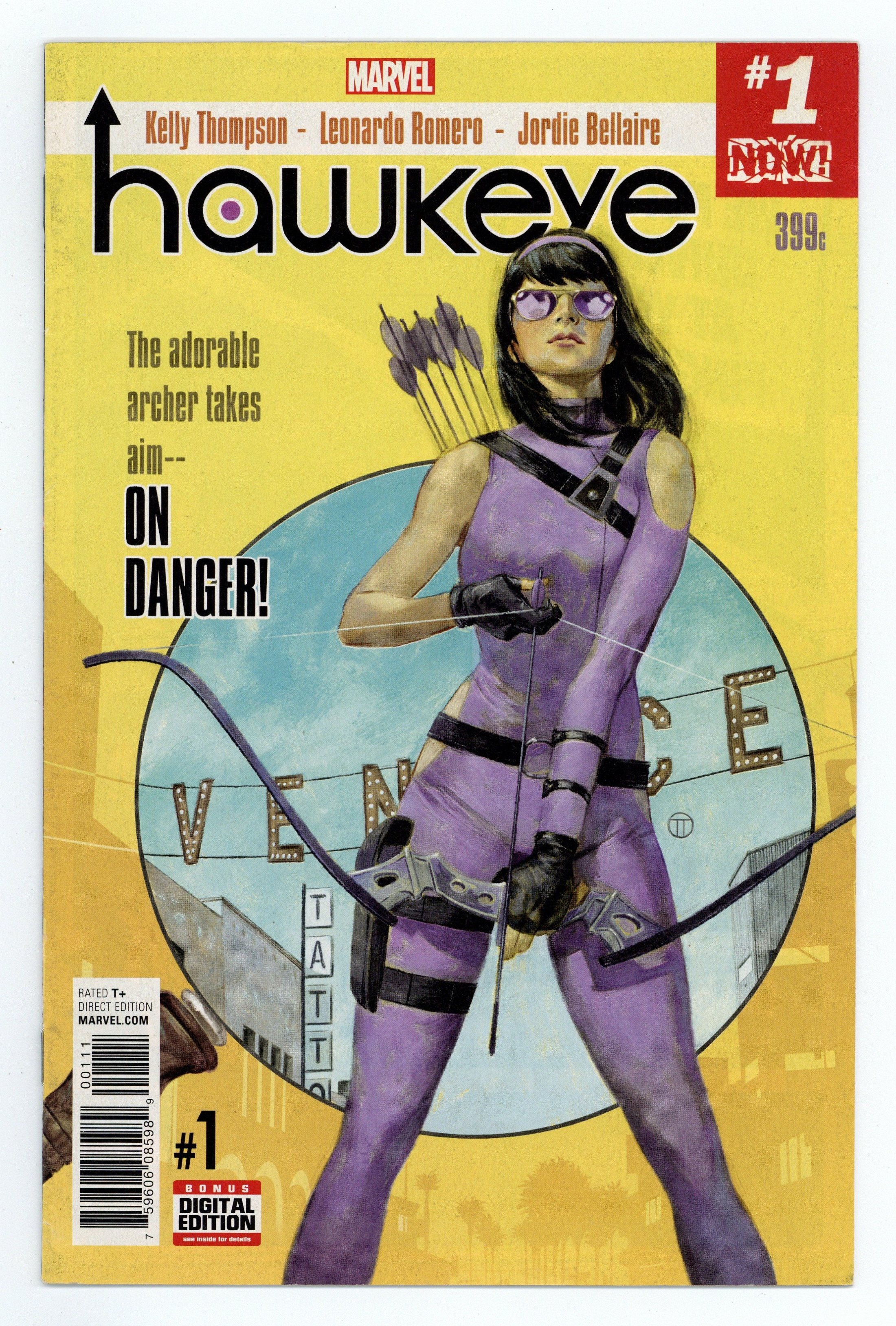 Tags: Avengers$2.65Written by Kelly Thompson. Art by Leonardo Romero. Cover by Julian Totino Tedesco. Remember Hawkeye? No not that Hawkeye, our favorite Hawkeye, the chick who puts the hawk in Hawkeye, the butt-kicking hero who had to save the other Hawkeye's butt all the time. Yup, you know her, it's the dazzling Kate Bishop making her solo comics debut! Kate is heading west and returning to Los Angeles, with her bow and arrow and P.I. badge in tow. There are crimes to solve and she's the best archer to handle 'em! The City of Angels has a new guardian angel. 28 pages, full color. Rated T+ Cover price $3.99.