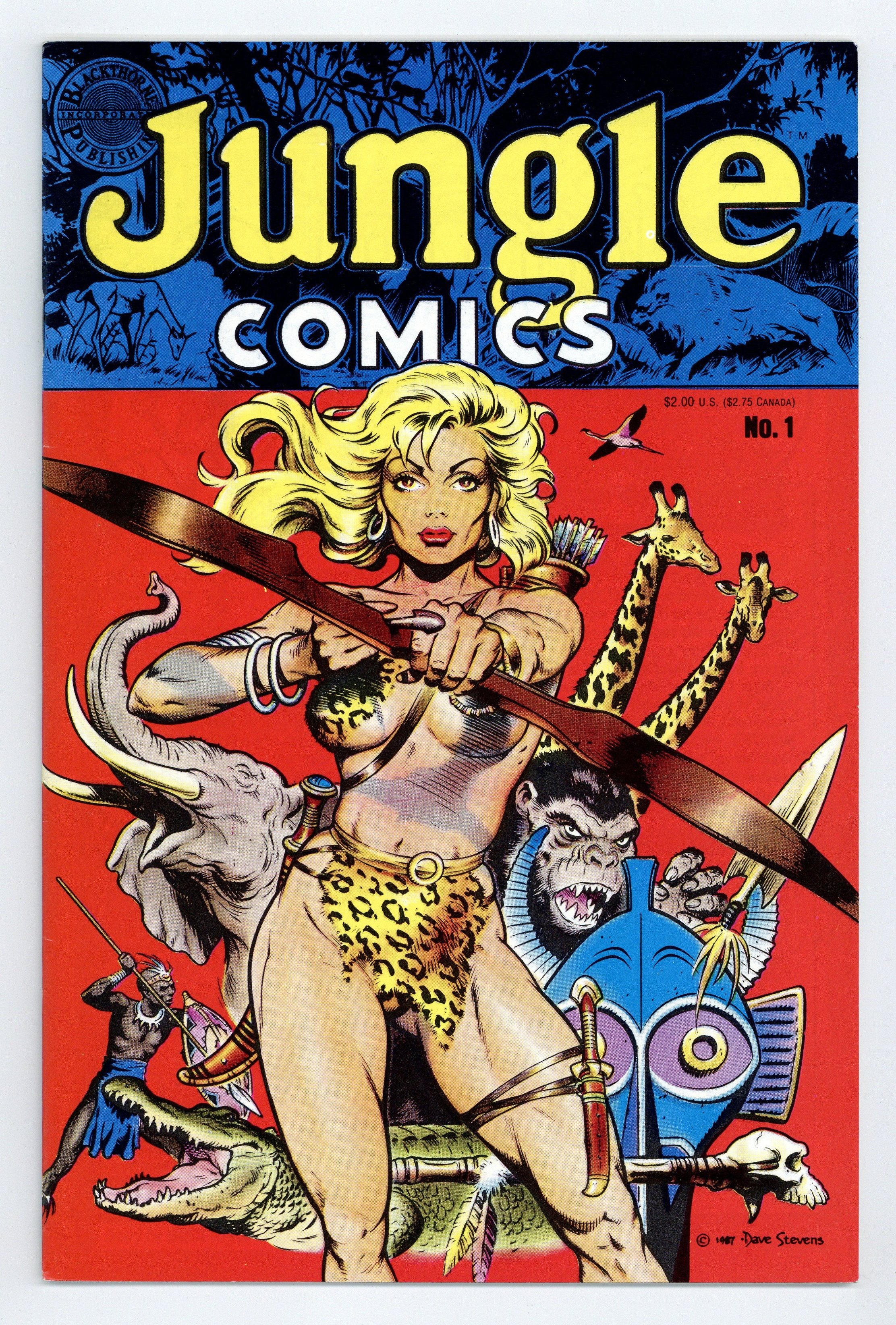 Stories by Bruce Jones. Art by Hal Jones, credited as Dragan Flaesc. Cover by Dave Stevens. Blackthorne presents new adventures inspired by the classic jungle adventure comics of the 1930s and 40s, and featuring two of their most enduring characters: Sheena, Queen of the Jungle and Kaanga, Jungle Lord. Terrific cover by longtime Sheena fan and beloved good-girl artist Dave Stevens. Sheena, Queen of the Jungle; Kaanga, Jungle Lord. 32 pages, B&W. Cover price $2.00.