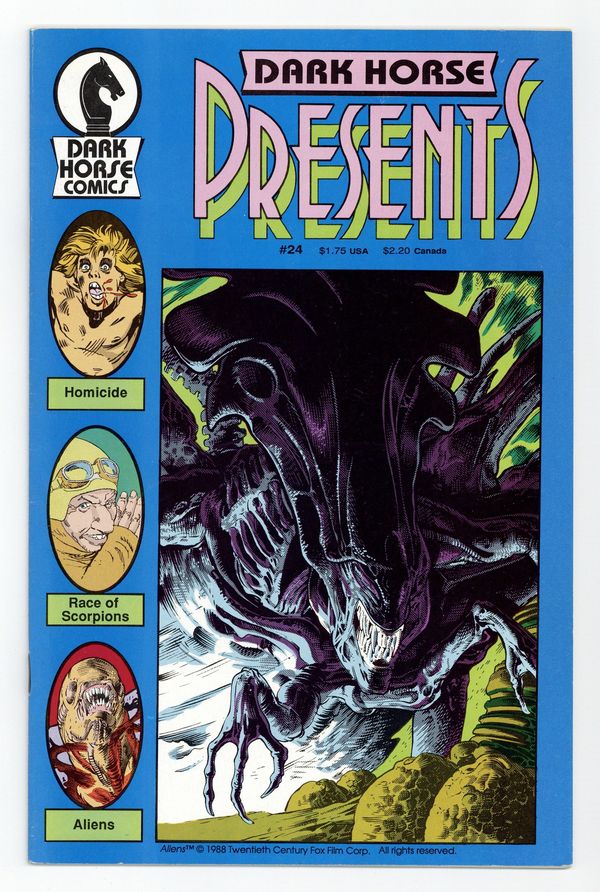 Tags: Anthology / CollectionPublished Nov 1988 by Dark Horse.$18.75Cover by Mark A. Nelson. Writer Mark Verheiden and artist Mark A. Nelson present an all-new "side bar" story to Dark Horse's ongoing Aliens miniseries as they take us inside the mind of an Alien Queen! Plus-Just in time for Halloween, Kull writer John Arcudi and The American artist Grant Miehm team up on a tale of murder and...cannibalism in the wilds of New York. And Leopoldo Duranona continues his exciting five-part science fiction epic Race of Scorpions. 32 pages, B&W. Cover price $1.75.