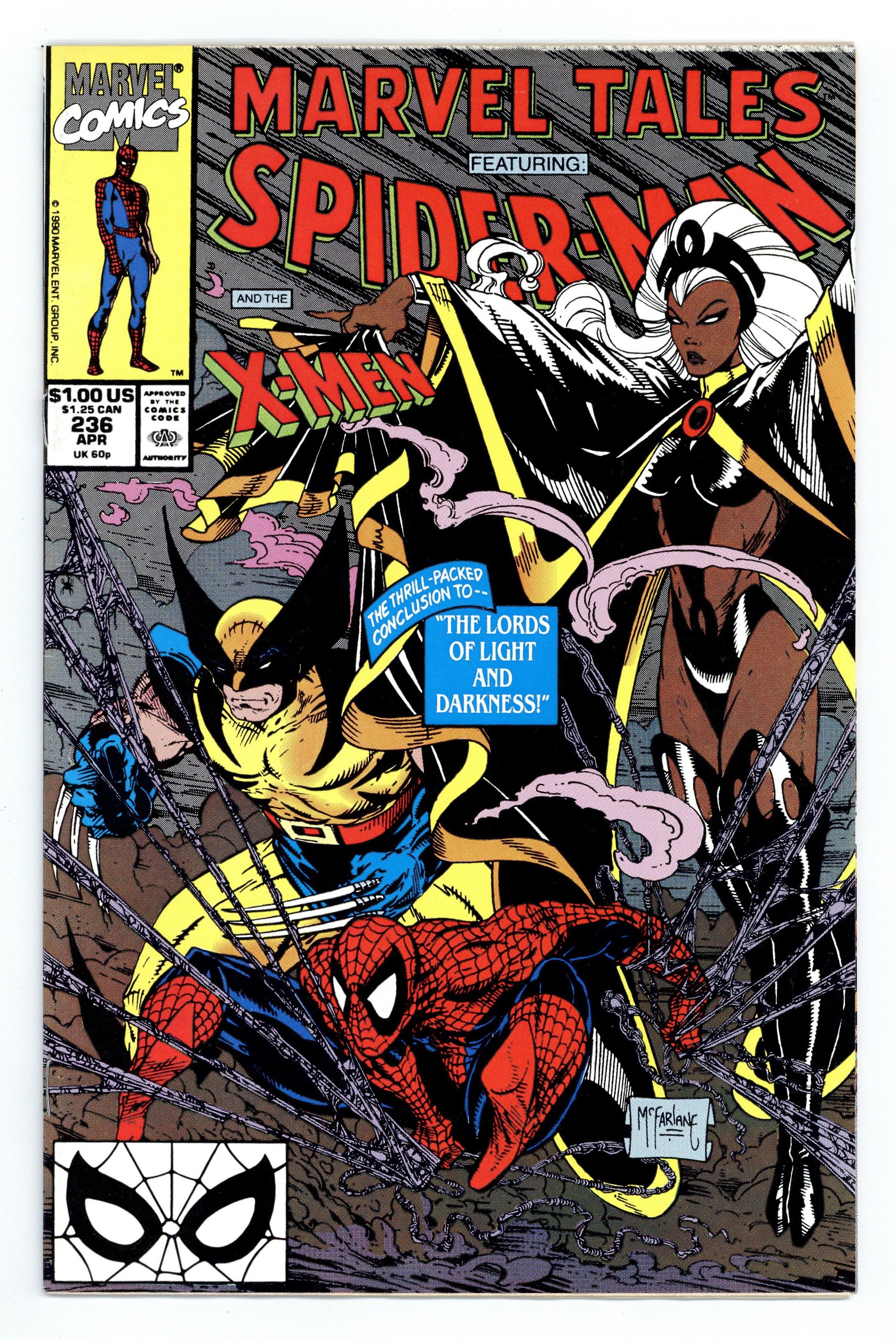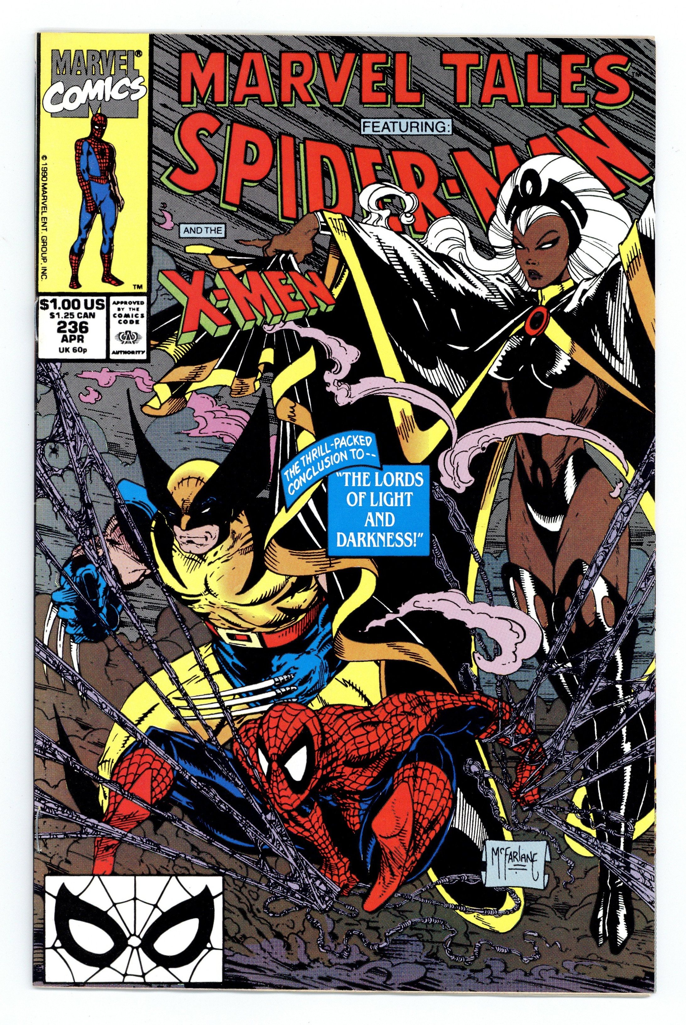 $16.75Direct Edition. Cover art by Todd McFarlane. The Lords of Light and Darkness Part 2], script by Bill Mantlo (Plot & Script), Chris Claremont (Plot), and Bonnie Wilford (Plot), pencils by Sal Buscema, inks by Mike Esposito; A band of researchers transformed into aspects of Hindu gods by a nuclear meltdown attacks Spidey and the X-Men; reprinted from Marvel Team-Up Annual (Marvel, 1976 series) #1. When Comes Captain Zooniverse!, script and art by Alan Kupperberg; Spider-Ham is possessed with the power of Captain Zooniverse and beats all of his foes for good. 36 pgs. $1.00. Cover price $1.00.