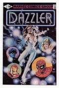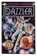 $23.50Error version with pages 24 & 25 printed in black and white. Dazzler origin in "So Bright This Star." Script by Tom DeFalco, pencils by John Romite Jr., inks by Alfredo Alcala. Guest appearances by Spider-Man, the X-Men (Storm, Wolverine, Colossus, Nightcrawler, and Sprite), the Avengers (Hawkeye, the Beast, Iron Man, the Wasp, and Captain America), and the Enchantress. This issue was not sold on newsstands, but available only from direst-sale outlets. Bob Larkin painted cover. Cover price $0.50.