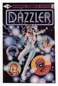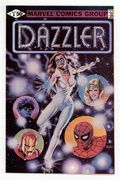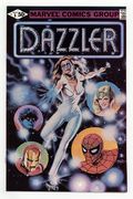 $27.50Error version with pages 24 & 25 printed in black and white. Dazzler origin in "So Bright This Star." Script by Tom DeFalco, pencils by John Romite Jr., inks by Alfredo Alcala. Guest appearances by Spider-Man, the X-Men (Storm, Wolverine, Colossus, Nightcrawler, and Sprite), the Avengers (Hawkeye, the Beast, Iron Man, the Wasp, and Captain America), and the Enchantress. This issue was not sold on newsstands, but available only from direst-sale outlets. Bob Larkin painted cover. Cover price $0.50.