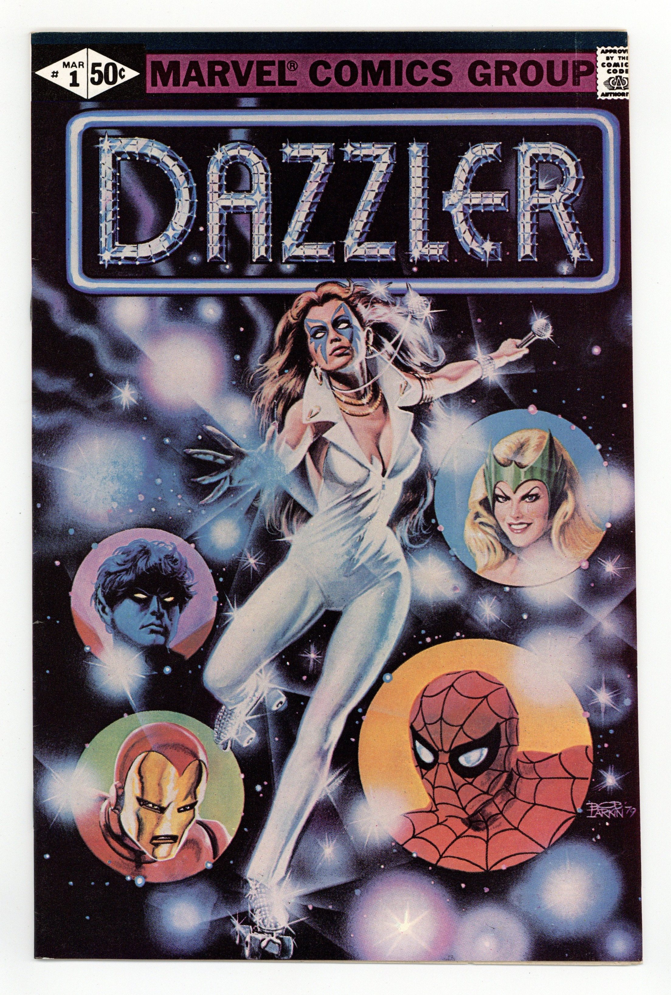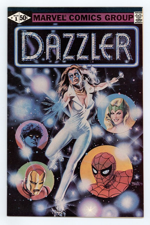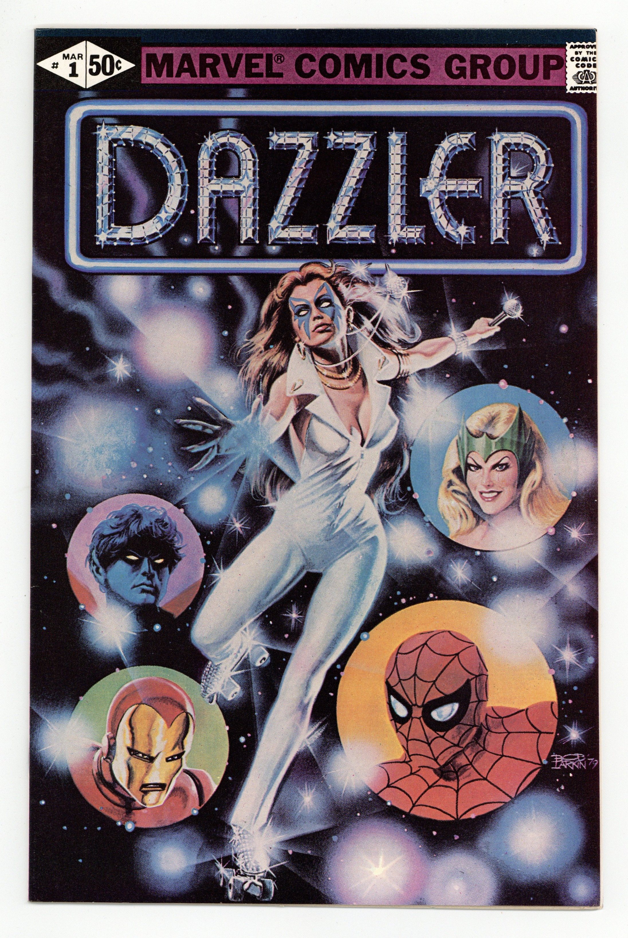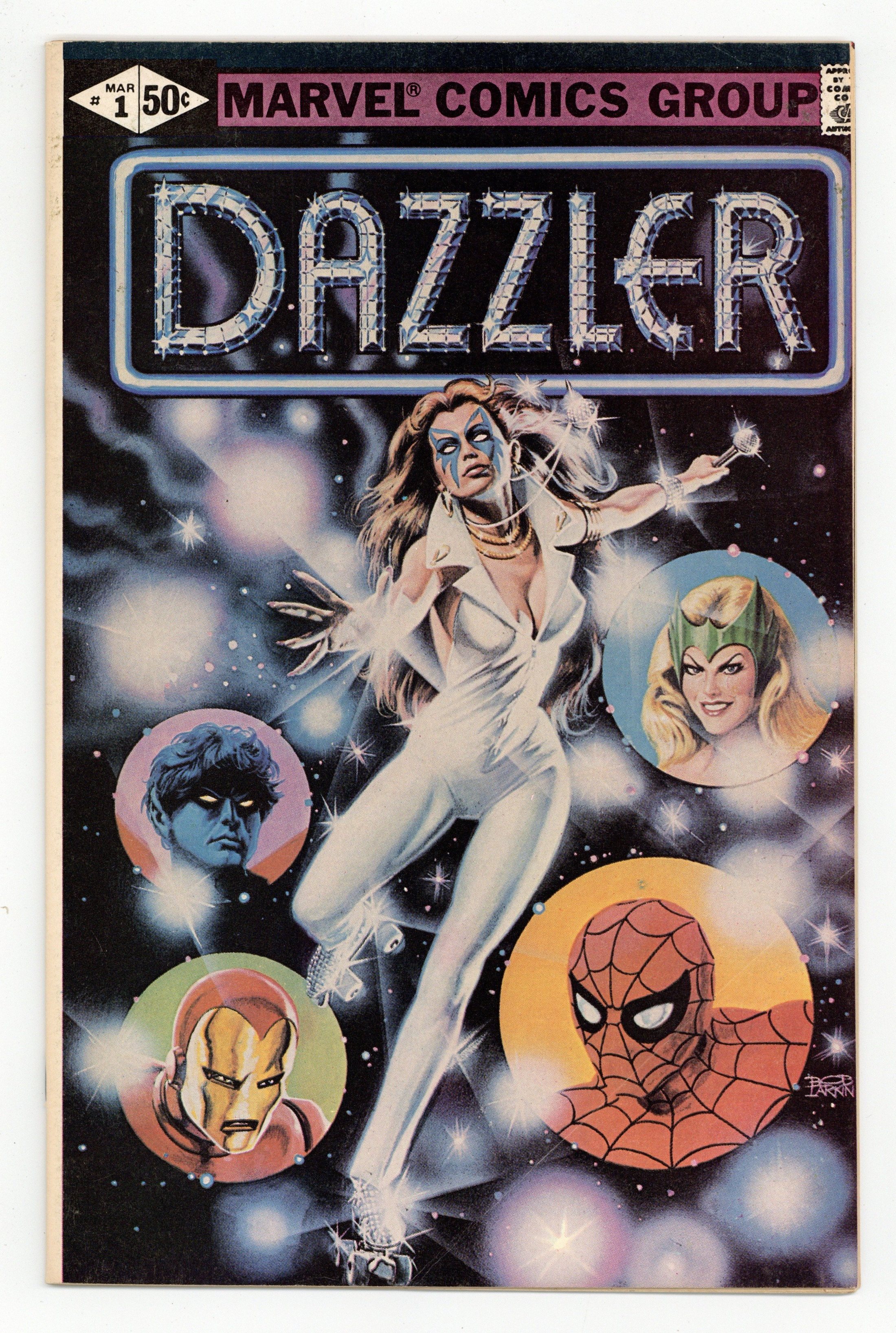 Error version with pages 24 & 25 printed in black and white. Dazzler origin in "So Bright This Star." Script by Tom DeFalco, pencils by John Romite Jr., inks by Alfredo Alcala. Guest appearances by Spider-Man, the X-Men (Storm, Wolverine, Colossus, Nightcrawler, and Sprite), the Avengers (Hawkeye, the Beast, Iron Man, the Wasp, and Captain America), and the Enchantress. This issue was not sold on newsstands, but available only from direst-sale outlets. Bob Larkin painted cover. Cover price $0.50.