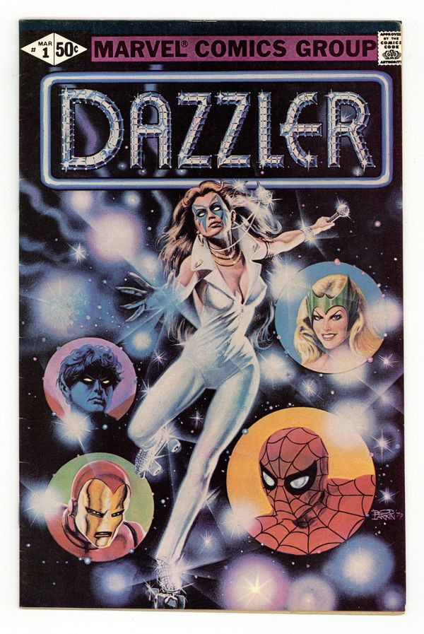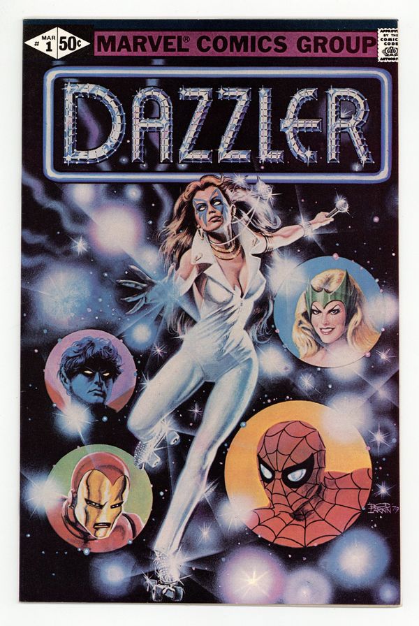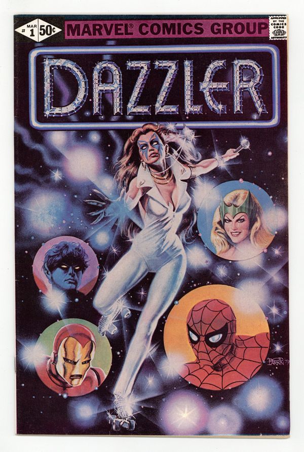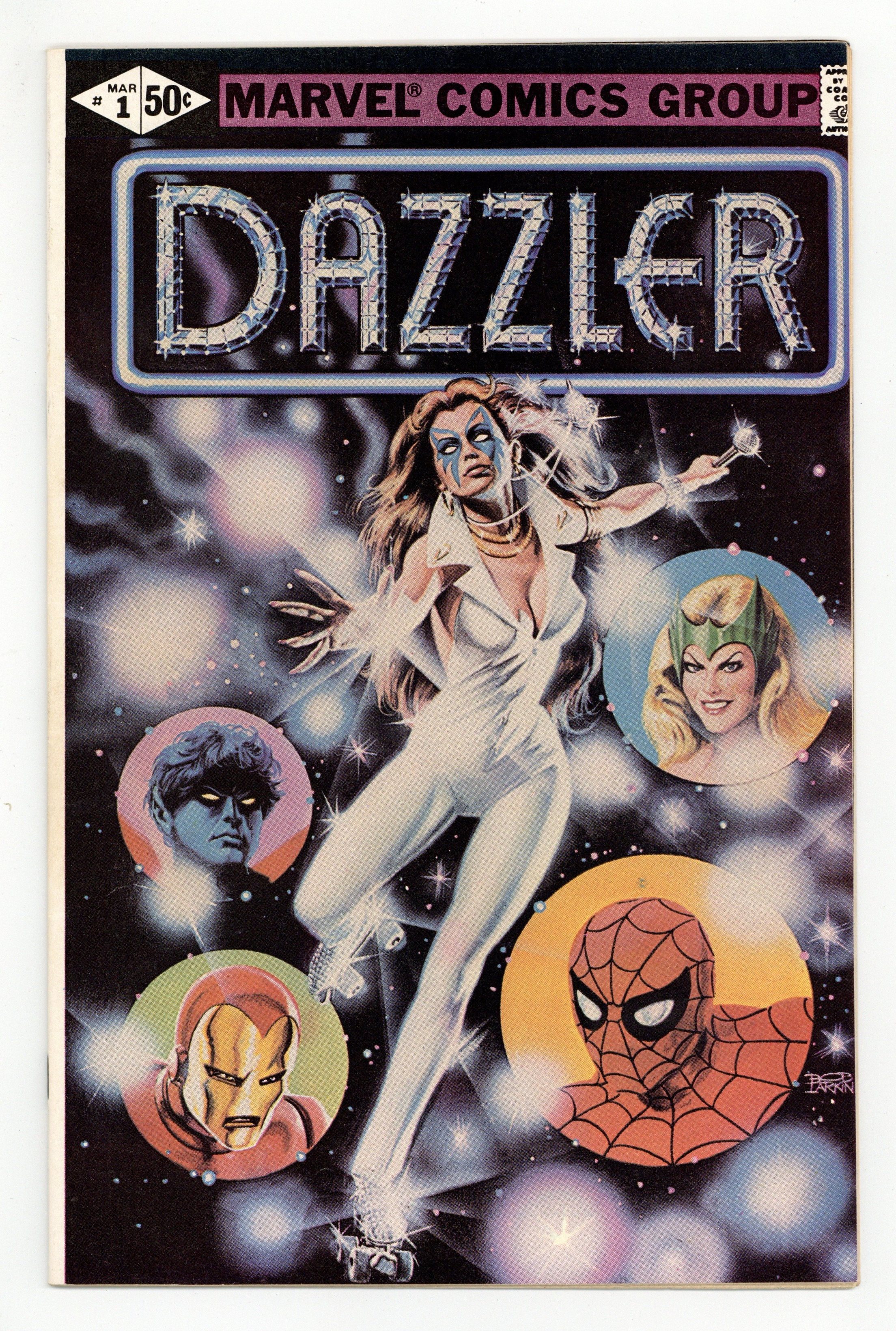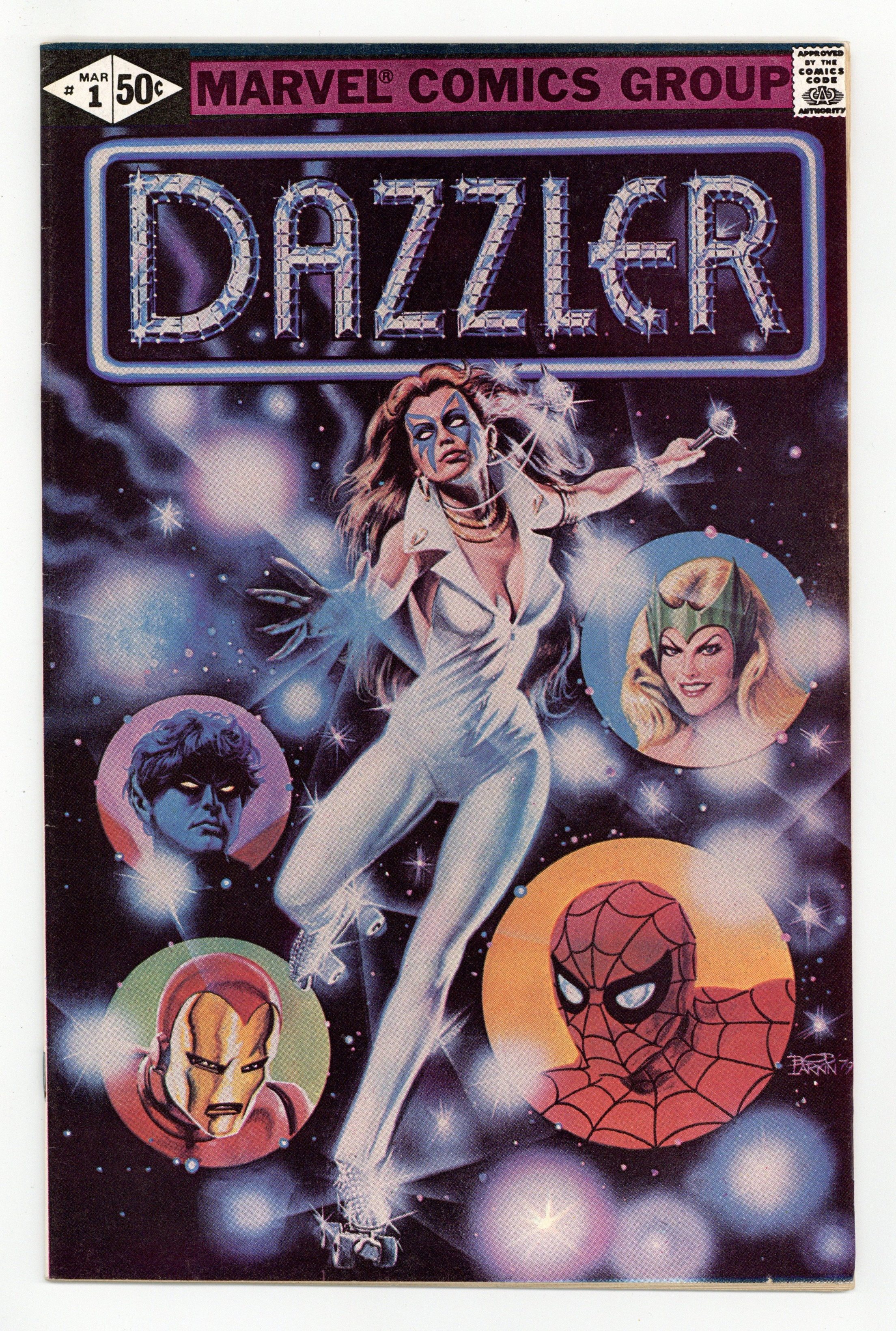 Error version with pages 24 & 25 printed in black and white. Dazzler origin in "So Bright This Star." Script by Tom DeFalco, pencils by John Romite Jr., inks by Alfredo Alcala. Guest appearances by Spider-Man, the X-Men (Storm, Wolverine, Colossus, Nightcrawler, and Sprite), the Avengers (Hawkeye, the Beast, Iron Man, the Wasp, and Captain America), and the Enchantress. This issue was not sold on newsstands, but available only from direst-sale outlets. Bob Larkin painted cover. Cover price $0.50.
