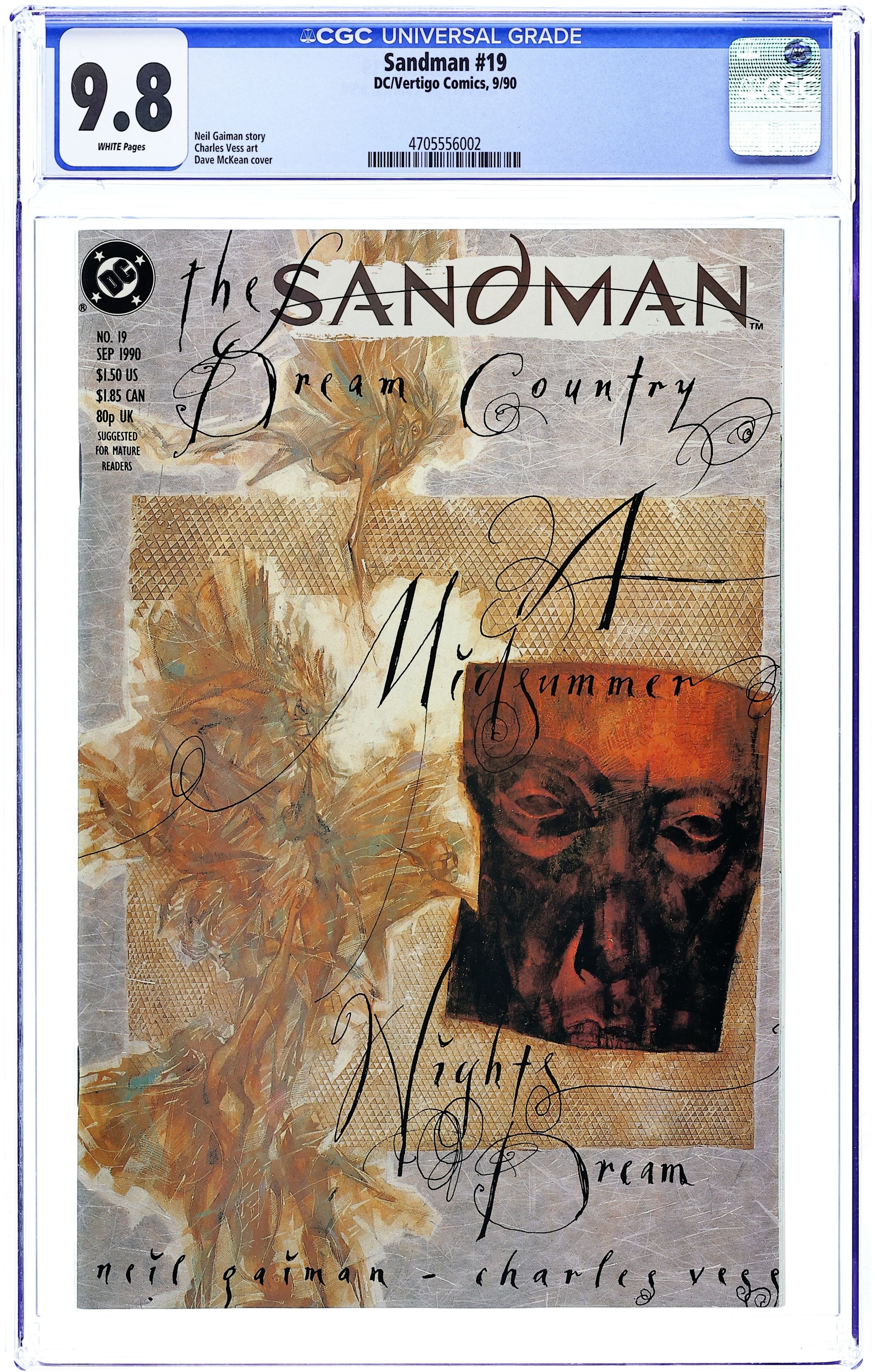Dream Country, Part 3 of 4: "A Midsummer Night's Dream." There's no business like show business as the Sandman gets a performance, Mr. Shakespeare gets stage fright, and Bottom gets an ass's head. Written by Neil Gaiman, with art by Charles Vess. Painted cover by Dave McKean. Suggested for Mature Readers. New Format. Cover price $1.50.