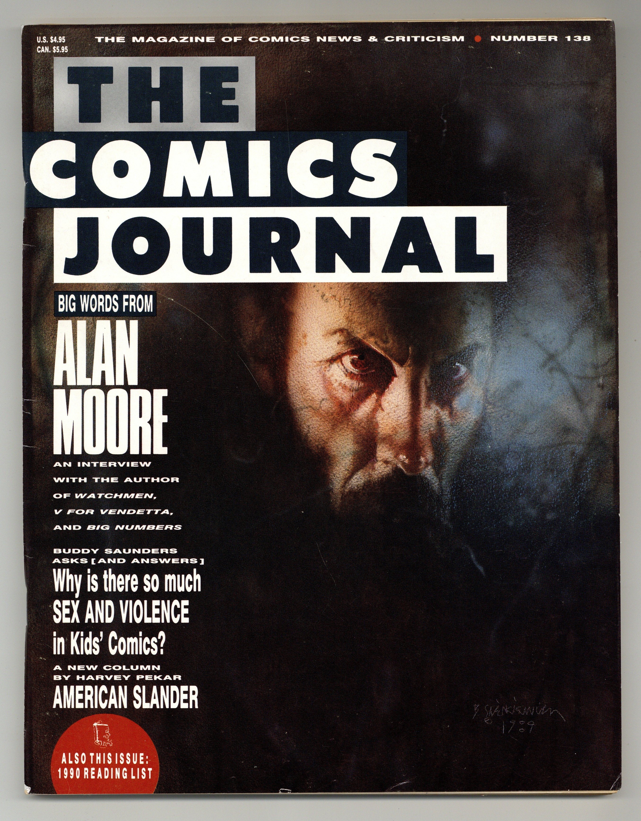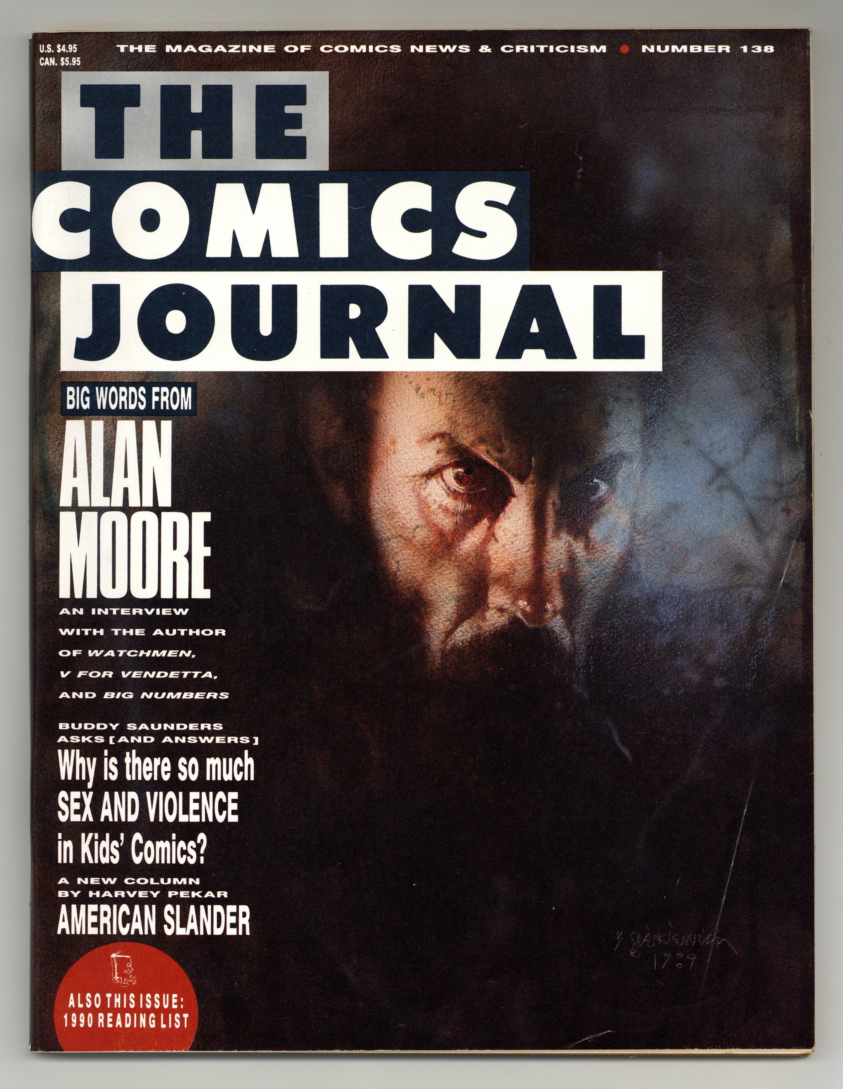 Published Oct 1990 by Fantagraphics.$16.00Big words from Alan Moore - an interview with the author of Watchmen, V for Vendetta and Big Numbers; Buddy Saunders asks (and answers) "Why is there so much sex and violence in kids' comics?"; 1990 reading list; American Slander - a new column by Harvey Pekar. Cover of Alan Moore by Bill Sienkiewicz. Cover price $4.95.