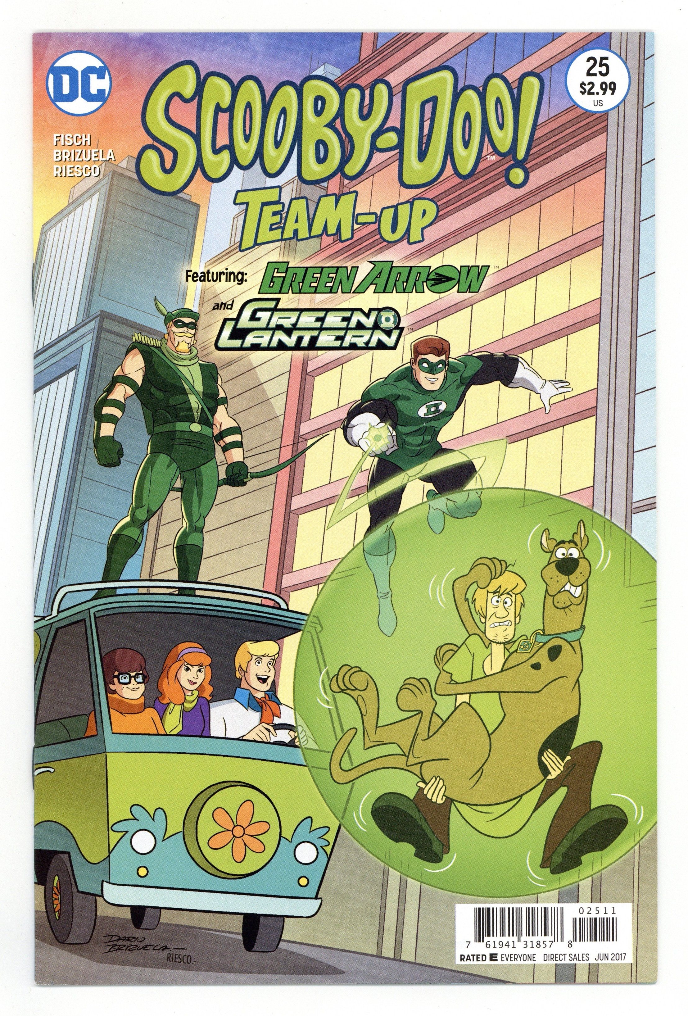$14.00Written by Sholly Fisch. Art and Cover by Dario Brizuela. The generation gap turns into a generation gasp when the aging hipsters of Karma Corners get locked up by the ghosts of their ancestors, who are fed up with the hijinks of their meddling kids! Even with the help of Green Lantern and Green Arrow, can Scooby and the gang crack the mystery of the ghosts and reunite the town? 32 pages, full color. Rated E Cover price $2.99.