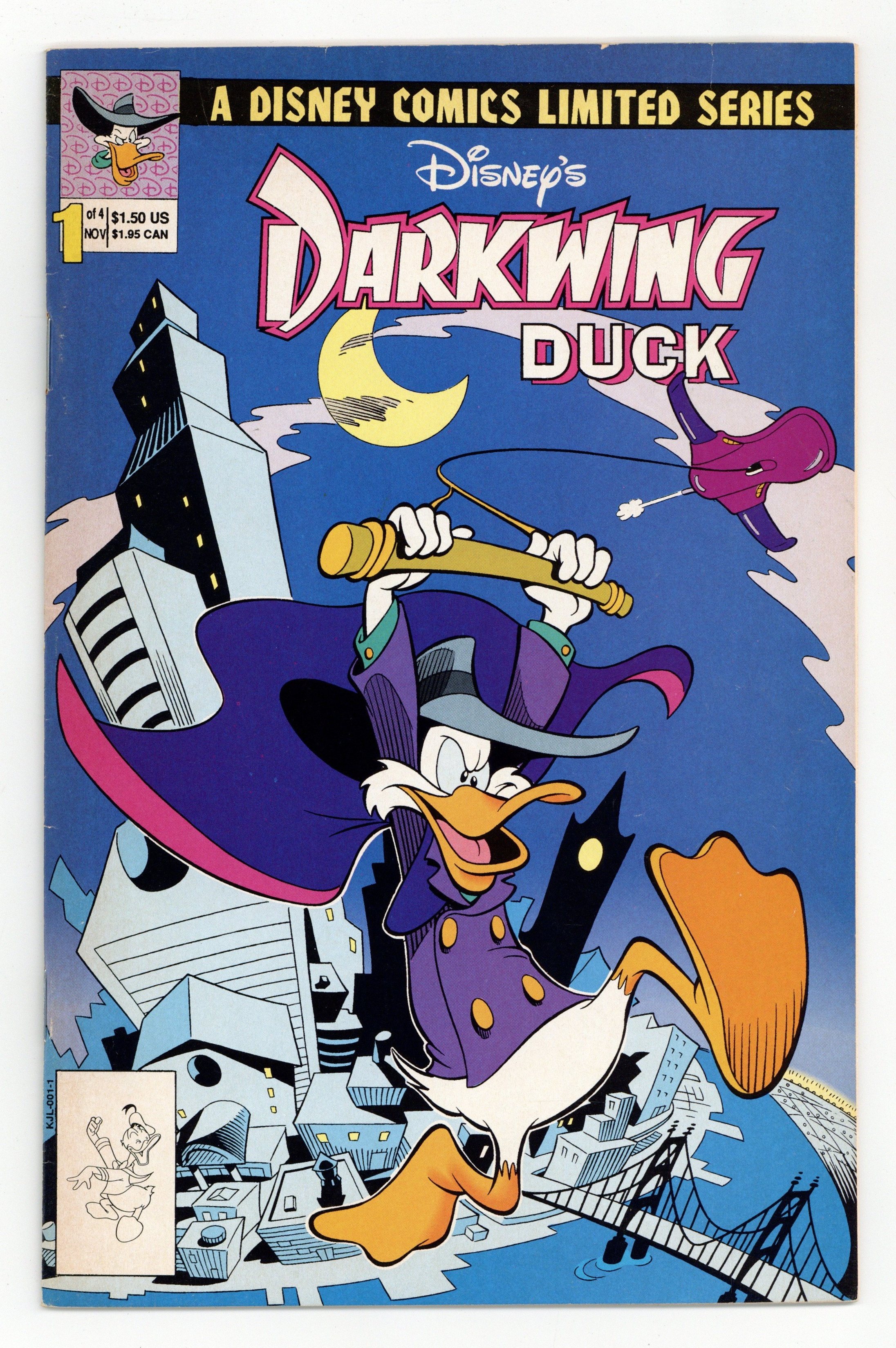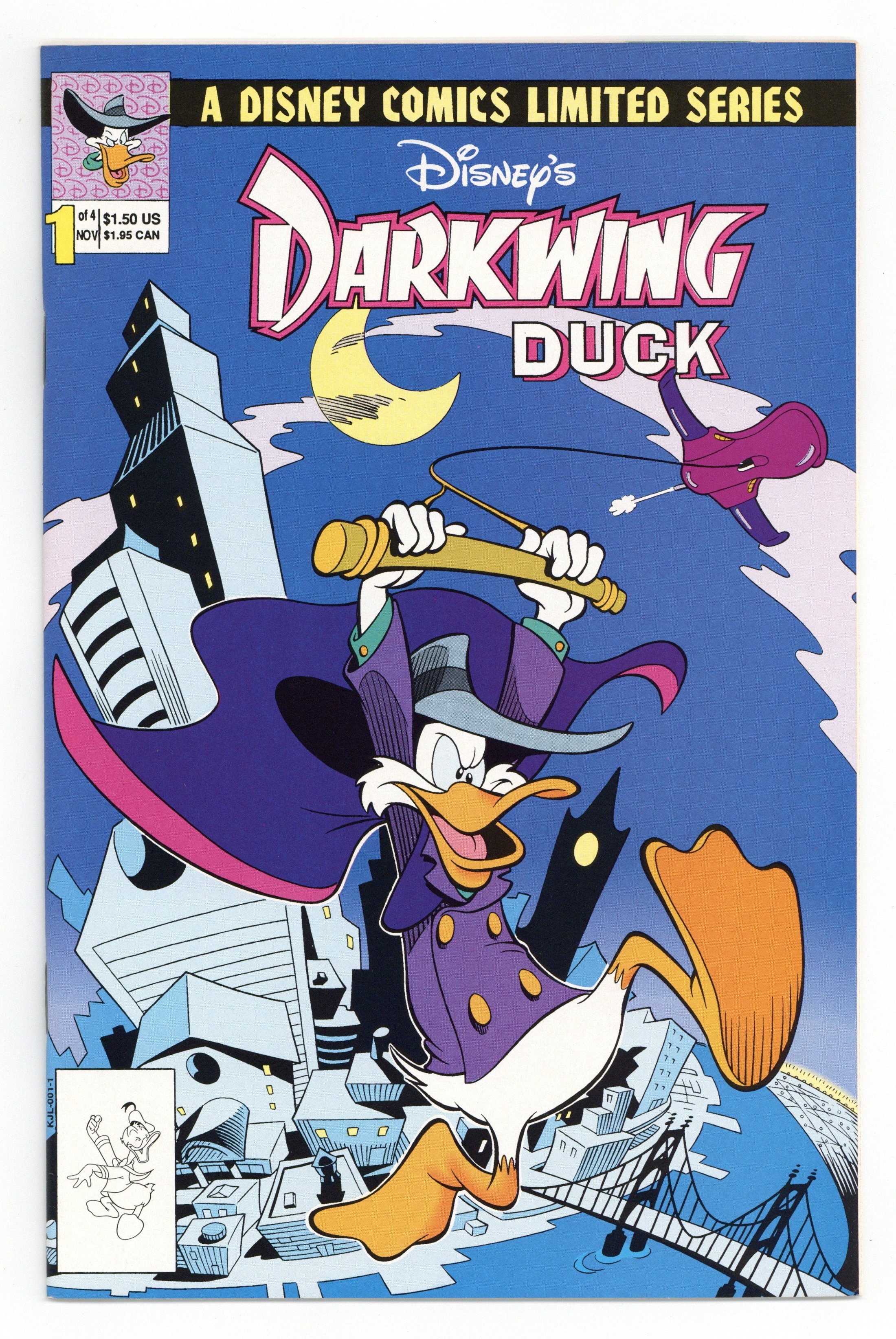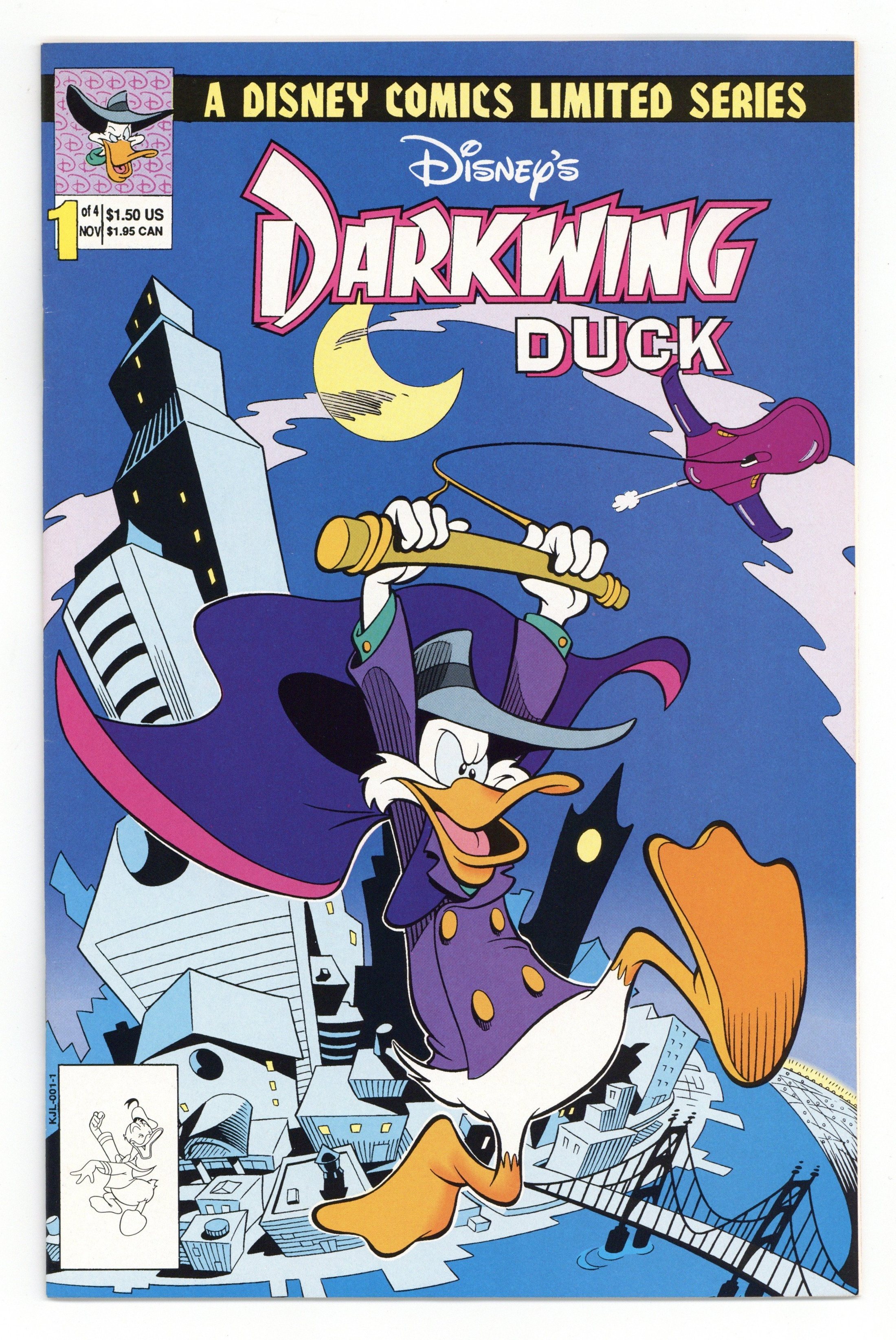 Tags: Disney Ducks & MicePublished Nov 1991 by Walt Disney Productions.$17.50Darkwing Duck, a.k.a. the Terror That Flaps In The Night, tries to foil Taurus Bulba's plot to steal the Ram Rod in Brawl in the Family Part One: "Darkly Dawns the Duck." Continued next issue. Script & pencils by John Blair Moore. Inks by George Wildman. Plus: 3-page interview with Jim Cummings, the voice of Darkwing Duck in the animated series. Cover by John Blair Moore & Gary Martin. Cover price $1.50.