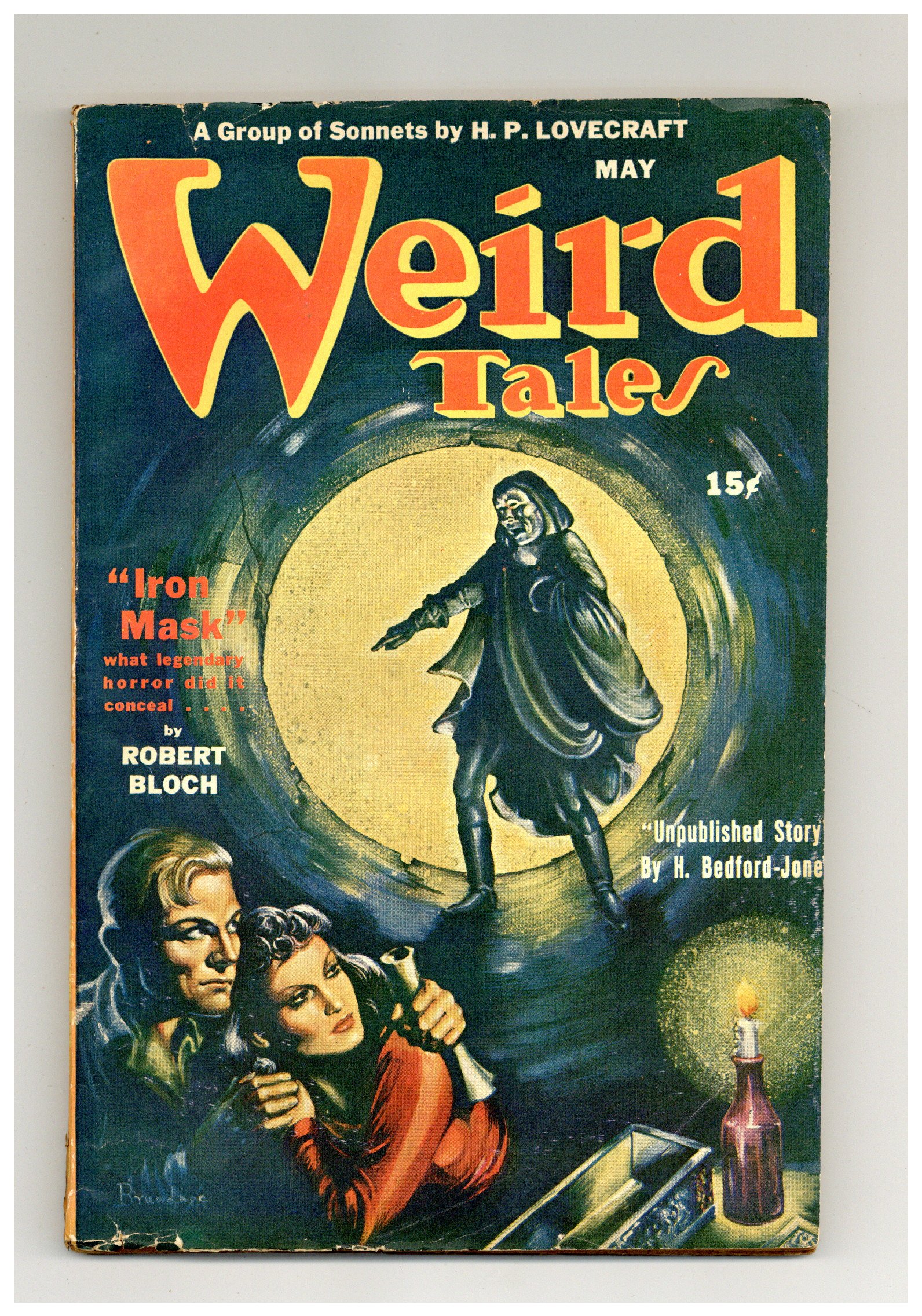 May 1944. Cover by Margaret Brundage. "Iron Mask" by Robert Bloch, "The Lake" by Ray Bradbury, plus other horror and supernatural tales by Allison V. Harding, Manly Wade Wellman, Alan Nelson, H. Bedford-Jones, Alice-Mary Schnirring, and Dorothy Quick. Also includes a few poems by H. P. Lovecraft. Illustrations by Margaret Brundage, Elton Fax, Boris Dolgov, A. R. Tilburne, Hannes Bok, Irwin J. Weill, Hugh Rankin, Andrew Brosnatch. 6 3/4-in. x 10-in., 96 newsprint pages, black and white (text with illustrations). Cover price $0.15.