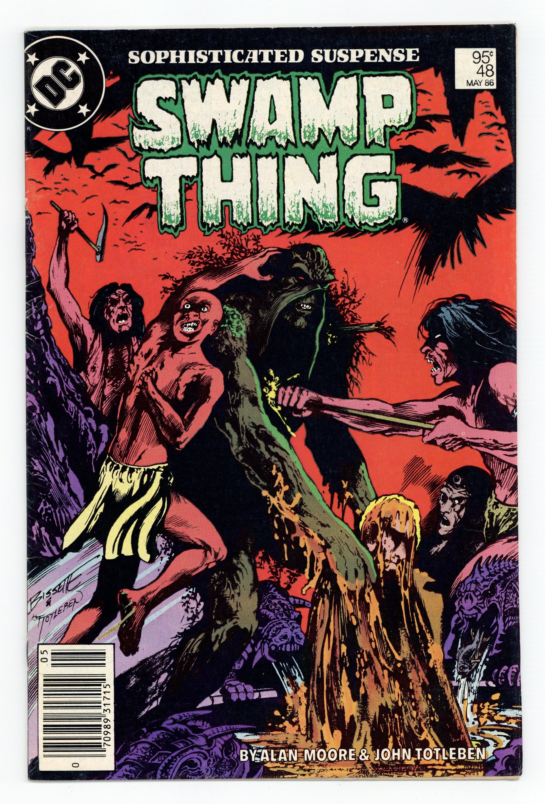 Canadian edition with $.95 cover price. Cover by Stephen R. Bissette and John Totleben. A Murder of Crows, script by Alan Moore, art by John Totleben; John Constantine's assembled cohort of mystics lead Swamp Thing to a cave where a group called the Brujeria are concocting a scheme to infect the world with evil--but when Swamp Thing tries to save Constantine from their clutches, he allows one of the mystics, now transformed into a evil, bird-like being, to escape. 36 pgs., full color. Cover price $0.95.