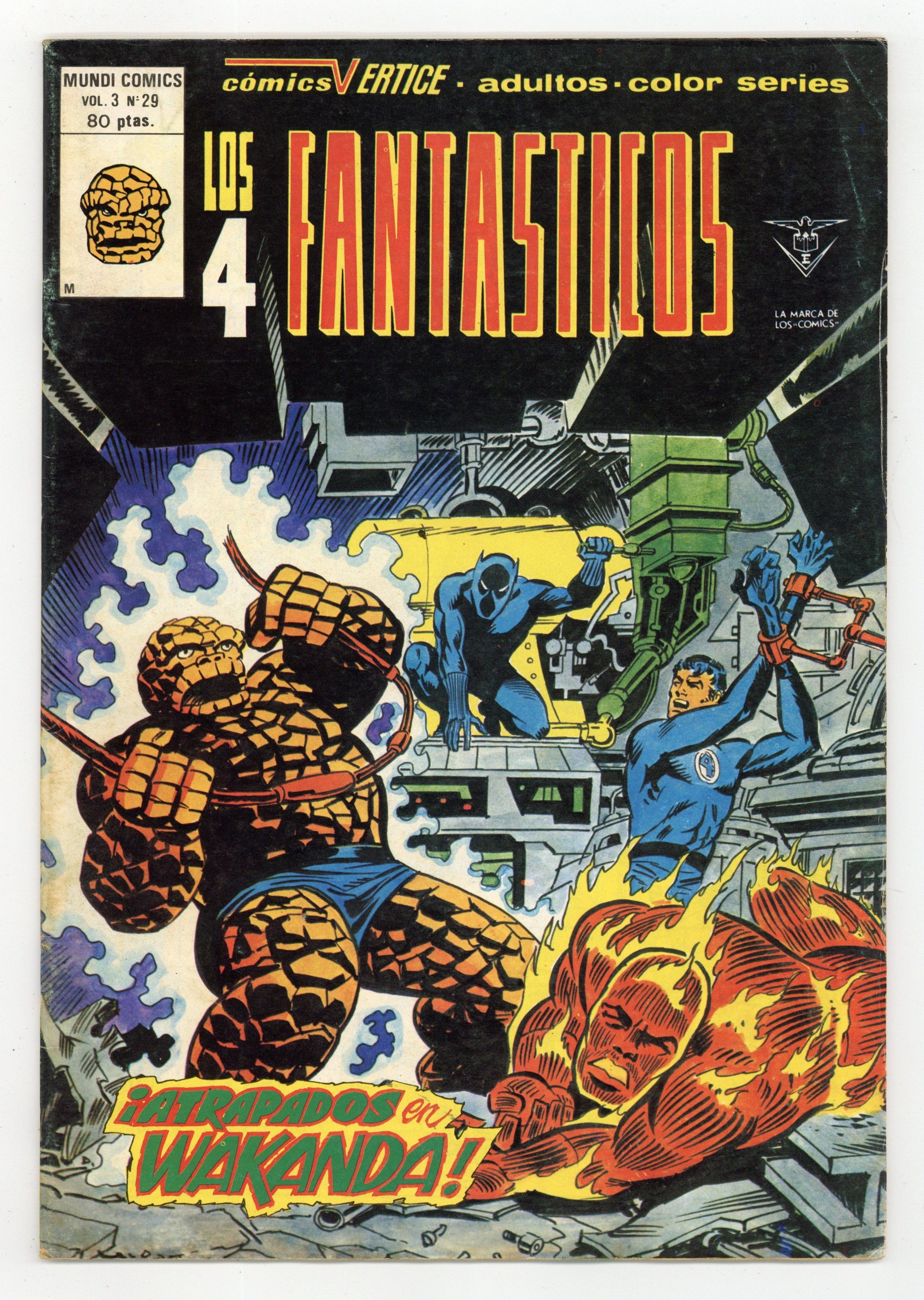 Spanish Series. This issue reprints material from Fantastic Four (1961 1st Series) #52-53 Story by Stan Lee. Art by Jack Kirby/Joe Sinnott art. Cover by R. Lopez Espi. 44 pages, full color, 7.5" x 10.5", Spanish language. NOTE #52 (1st app Black Panther). #53 (Partial 2nd app Black Panther; 1st app Klaw, T'Chaka, & vibranium)