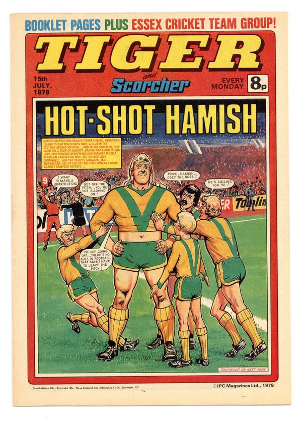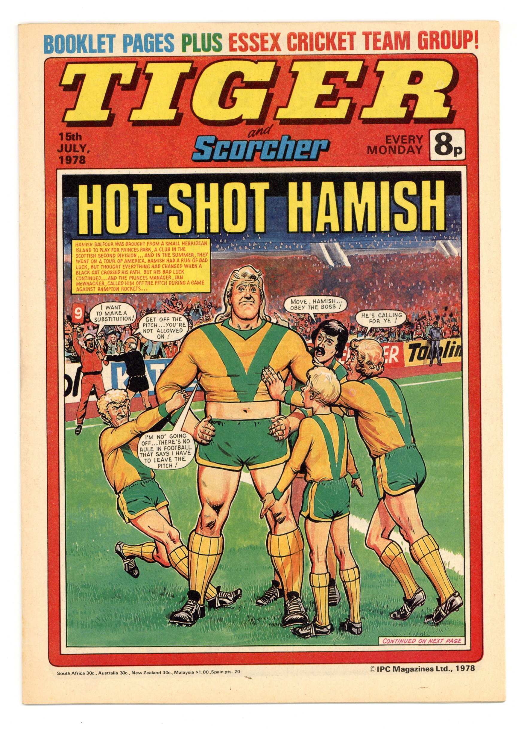 $2.50Tiger and Scorcher - July 15, 1978 - Published by Fleetway Publications, Ltd. in the U.K. Action/adventure/sports stories featuring Nelson Lord, T.I.G.E.R. Agent, Typhoon Tracy, the Mighty Smiths, Roy of the Rovers, Skid Solo, Casey's Crew, the Black Archer, Robot Builders, the Fiery Furnaces, Olac the Gladiator, Jet-Ace Logan, and more. Newsprint, 9-in. x 11-in in., 40 pages, B&W.