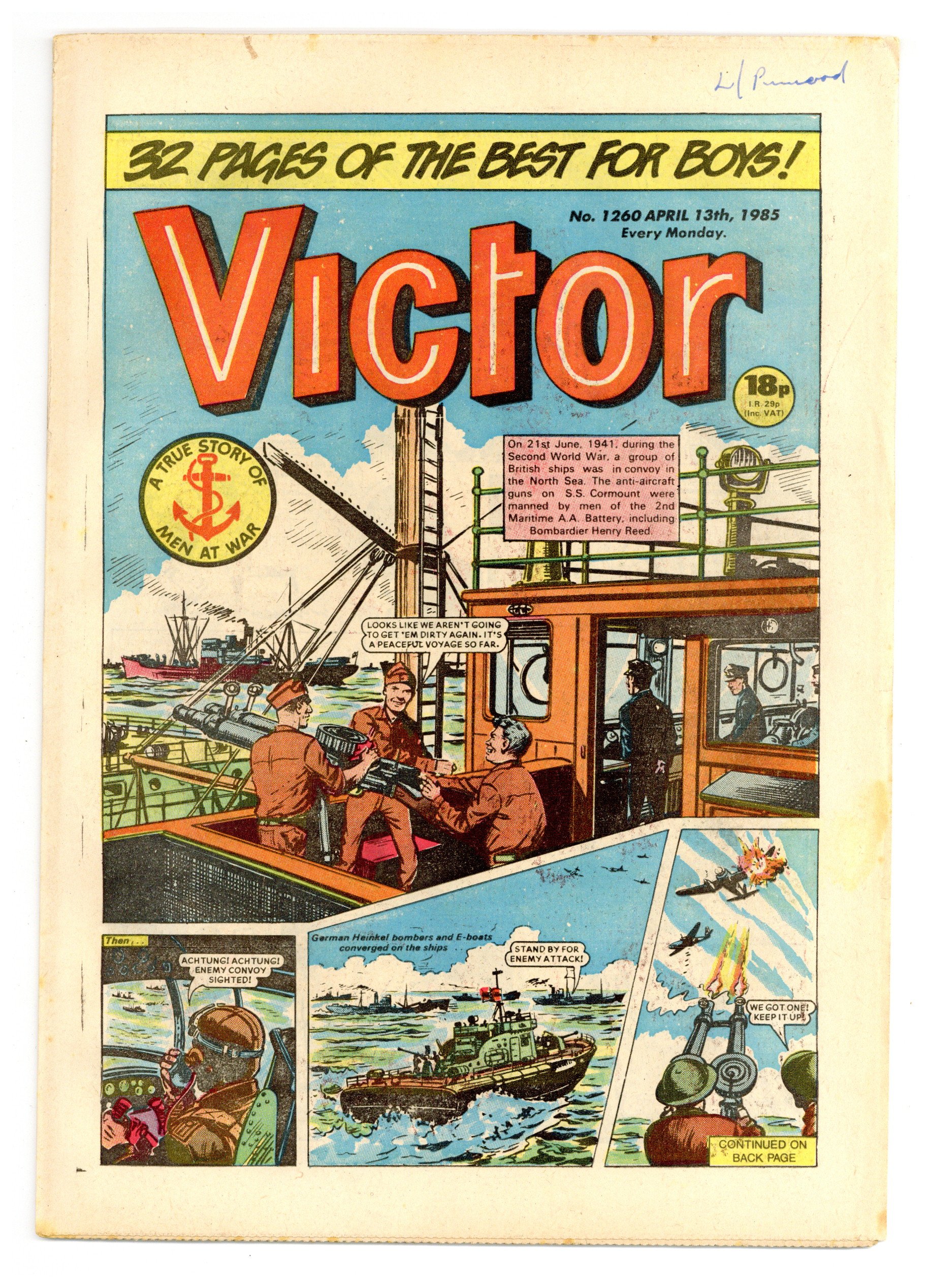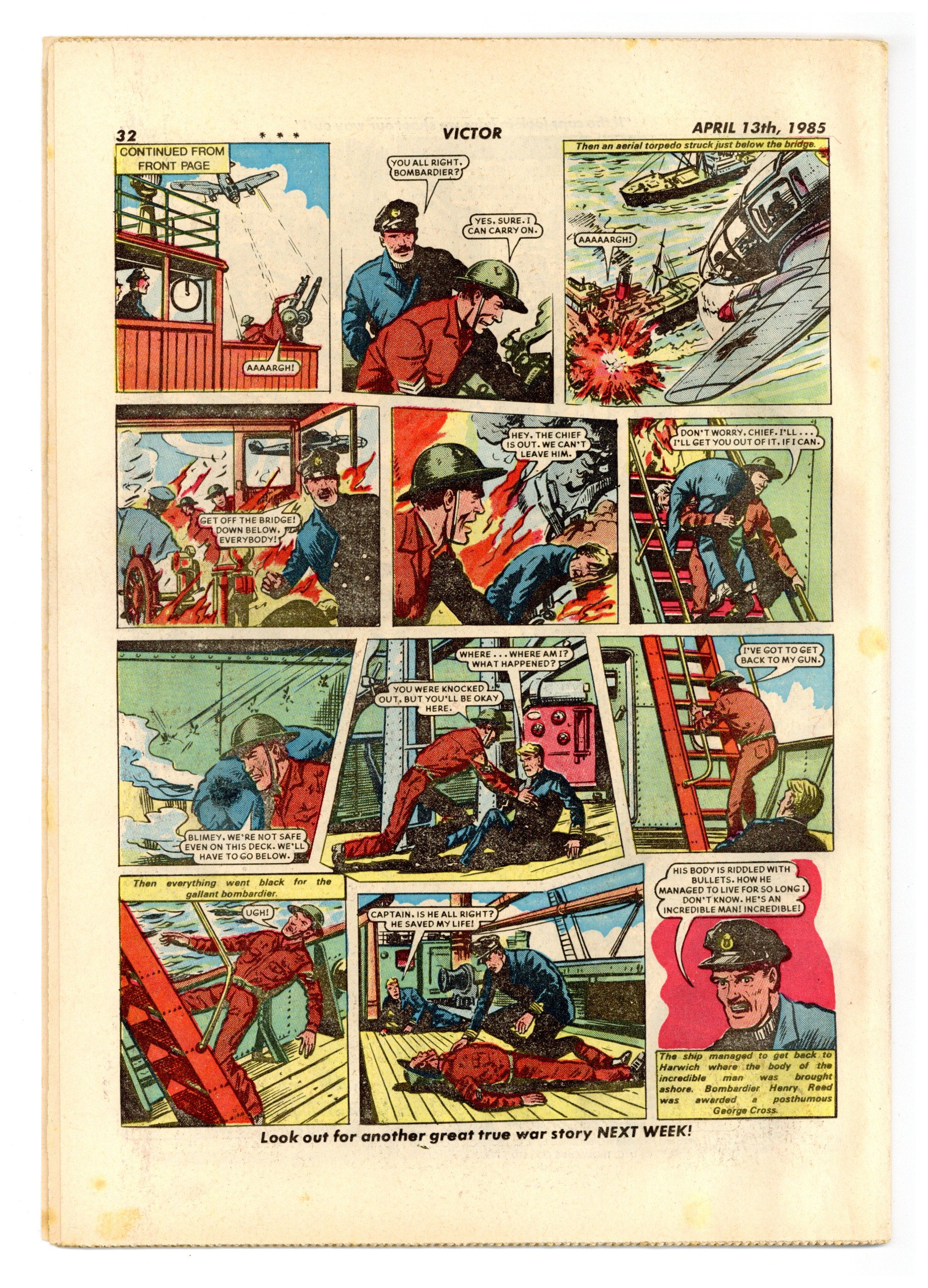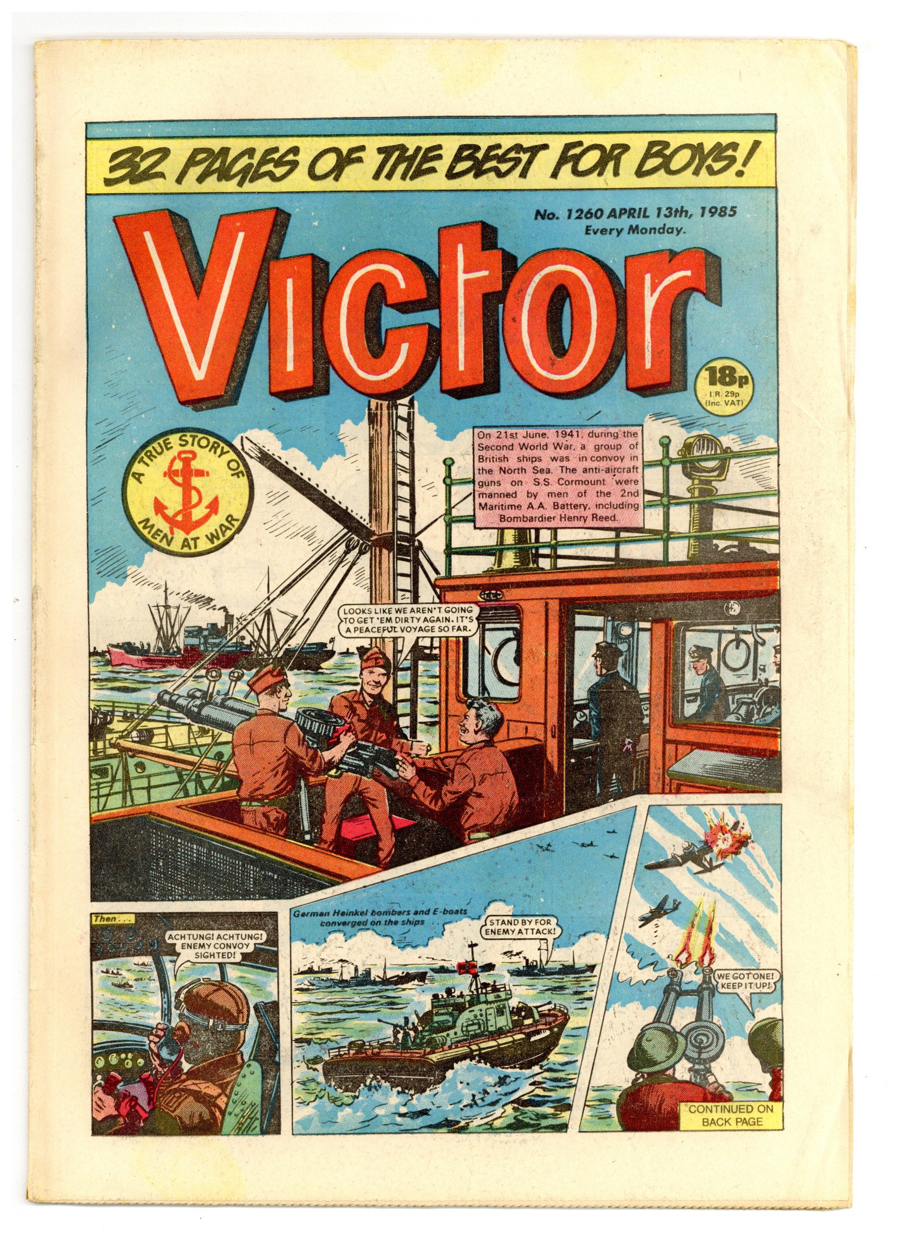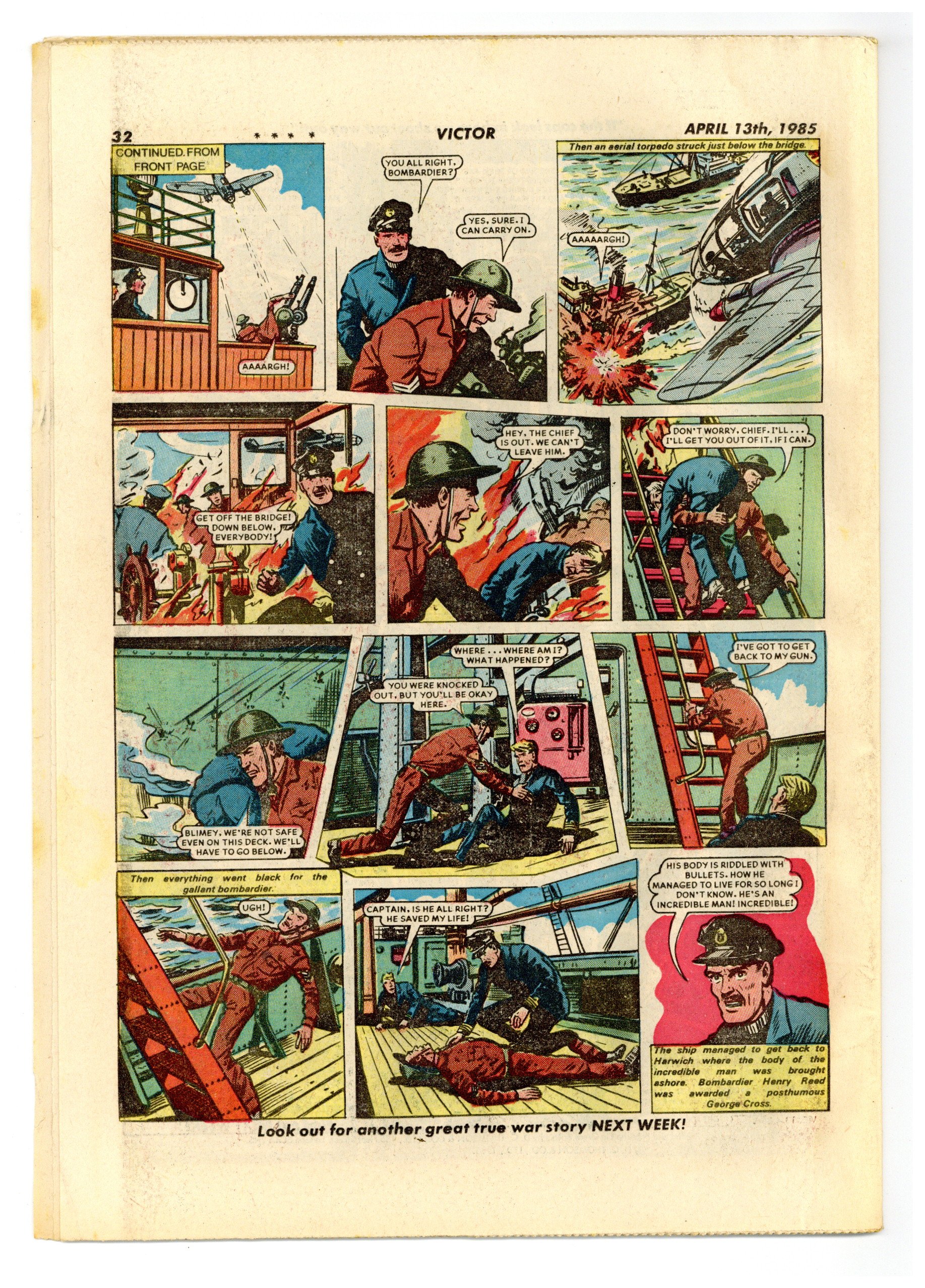 April 13, 1985. Published by D.C. Thompson and Co. Ltd. in Great Britain. Action/adventure stories feature the Quest of the Last Six Hundred, Johnny Gurkha, the Punch Pirate, Morgyn the Mighty, Legion of the Lost, Duke Farlow, Taneebo the Thunderbolt, and more. 8.5 x 11.75; black and white; 32 pages; 18p cover price.