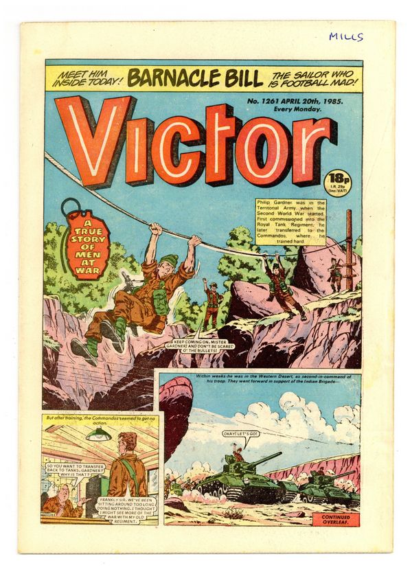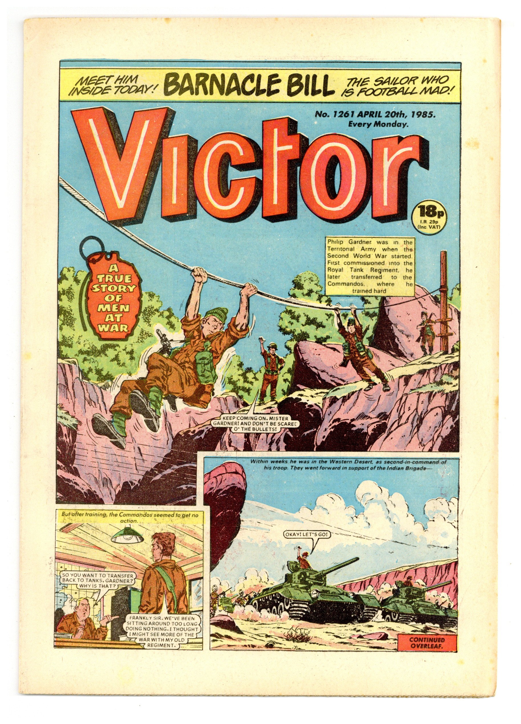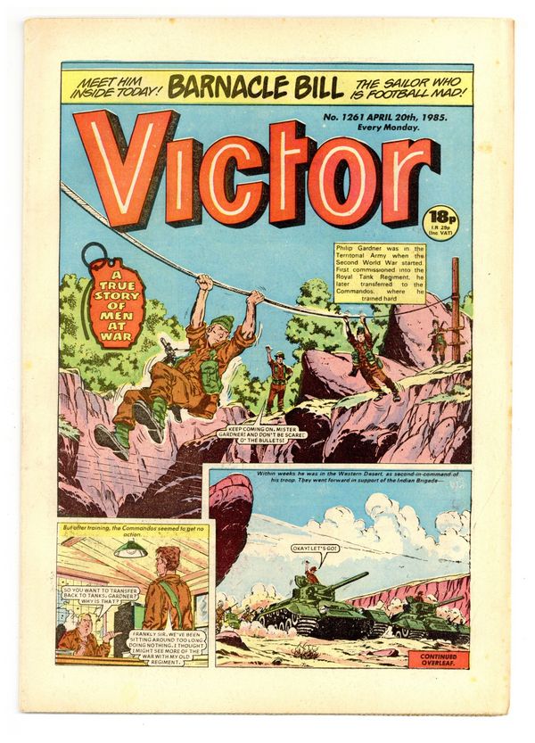April 20, 1985. Published by D.C. Thompson and Co. Ltd. in Great Britain. Action/adventure stories feature the Quest of the Last Six Hundred, Johnny Gurkha, the Punch Pirate, Morgyn the Mighty, Legion of the Lost, Duke Farlow, Taneebo the Thunderbolt, and more. 8.5 x 11.75; black and white; 32 pages; 18p cover price.