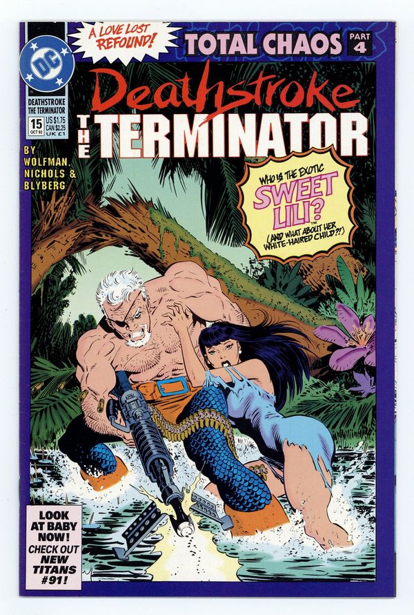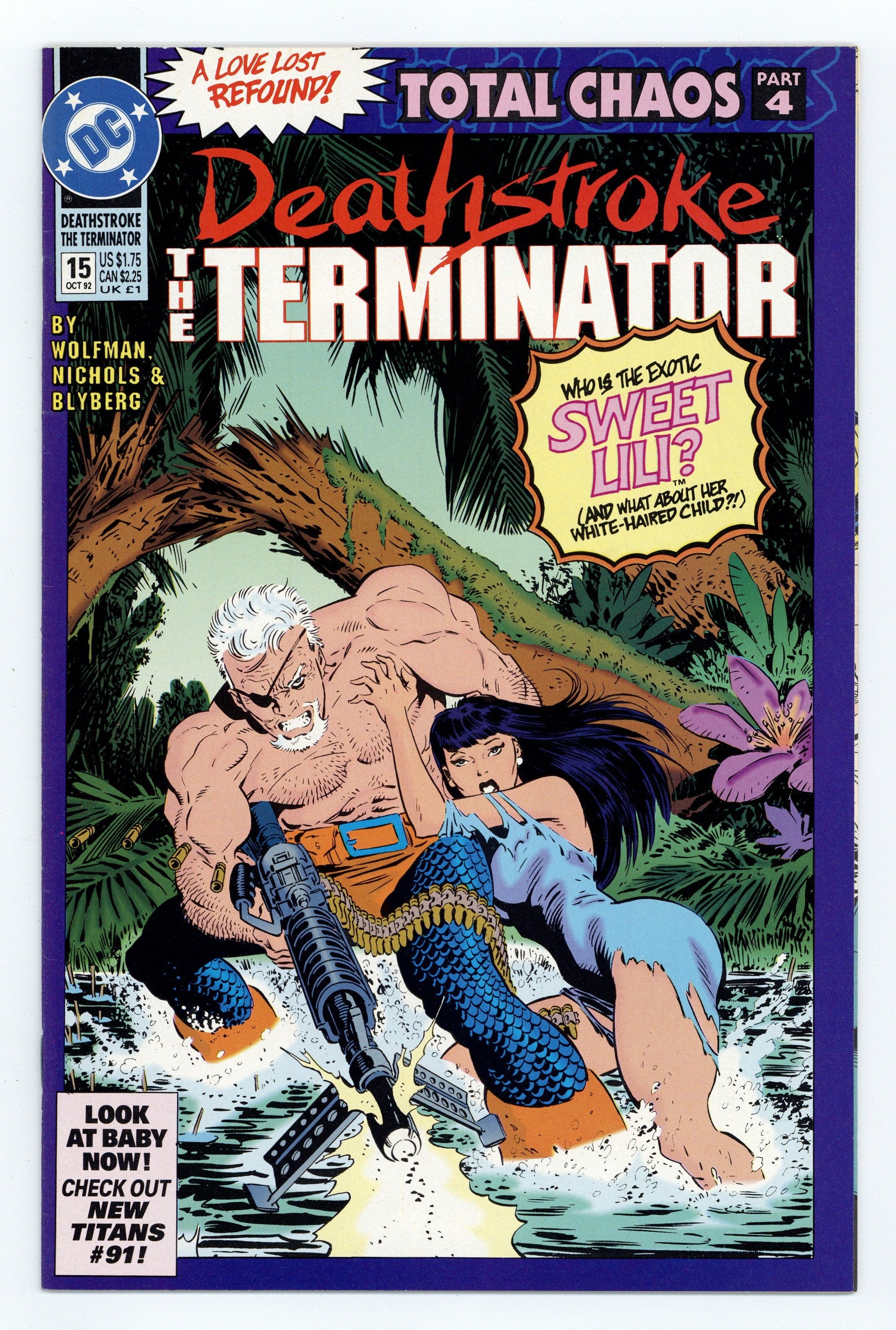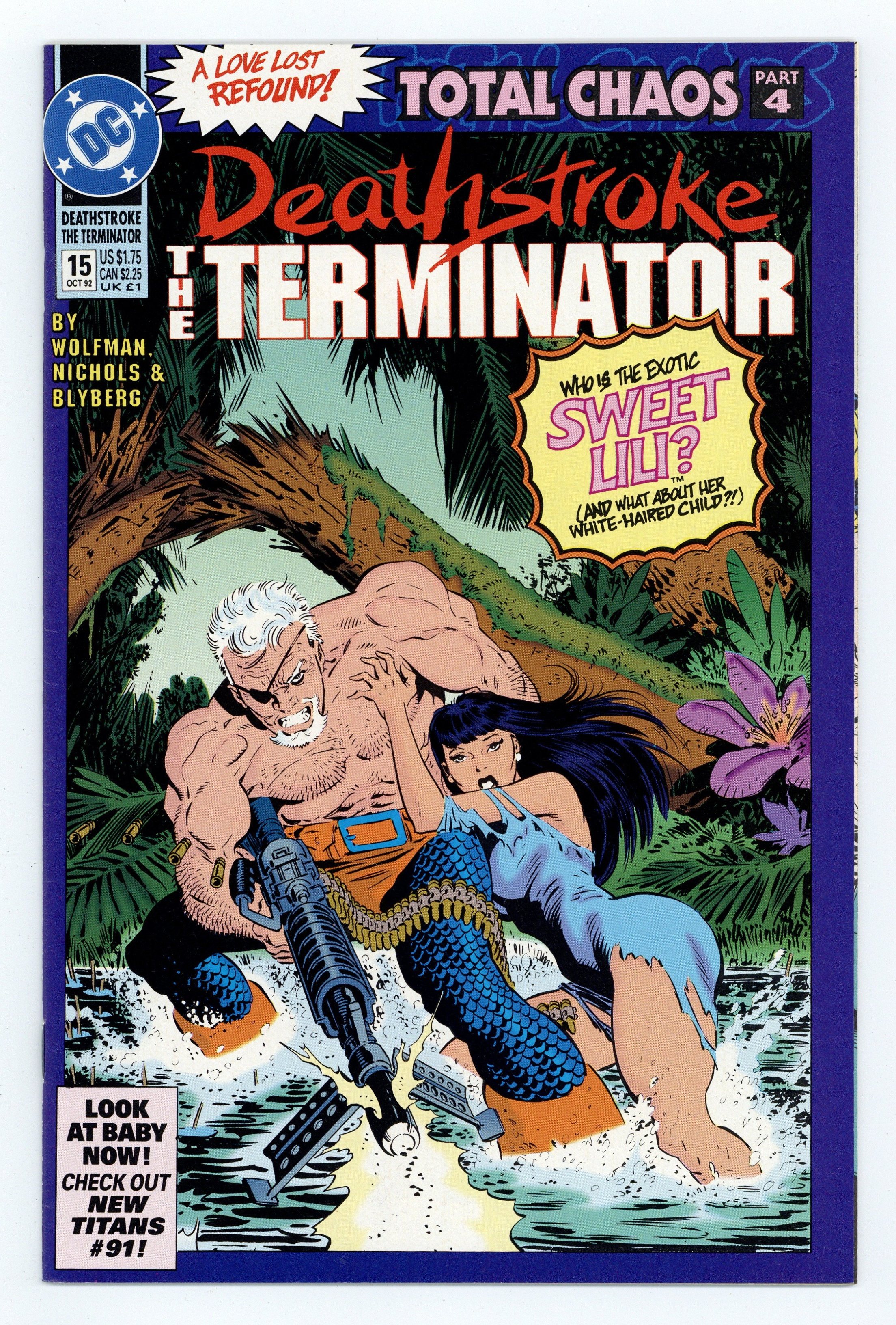 Tags: Total Chaos (part 4), Deathstroke$16.00Total Chaos: Part 4 of 9. "Escape from New York!" Guest-starring the New Teen Titans. Story by Marv Wolfman. Art by Art Nichols and Will Blyberg. Cover by Mike Zeck. Story continued from Team Titans #1. Slade is dying and the means of saving his life may lie in the Terminator's past. Plus, who is Sweet Lili, not to mention her white-haired daughter? Story continues in New Teen Titans (1984-1996 2nd Series) #91. NOTE: This issue features the 1st appearance of Rose, Slade Wilson's daughter and future Ravager. Cover price $1.75.