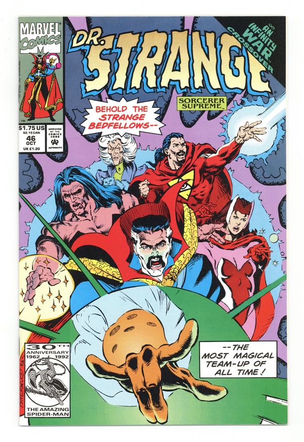 Tags: Infinity War (1992) (part 5.2), Marvel Legacy Numbering: Doctor Strange (part 310), Doctor Strange$4.30Cover art by Geof Isherwood. Strange Bedfellows, script by Roy Thomas, Jean-Marc Lofficier [as R.J.M. Lofficier], and Randy Lofficier [as R.J.M. Lofficier], art by Geof Isherwood; Doc and the other Mystic heavyweights try to free the Earth from it paralysis, only to encounter the Masked Dr. Strange. The Scarlet Witch, Dr. Druid, and the Sleepwalker guest star in this Infinity War crossover. Story continues from Infinity War 4. 36 pgs. $1.75. Cover price $1.75.
