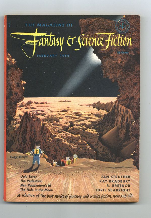 February 1952. Cover by Chesley Bonestell. Fantasy and science fiction stories by H. B. Fyfe, L. Sprague DeCamp & Fletcher Pratt, Jan Struther, L. Major Reynolds, R. Bretnor, Mildred Clingerman, John R. Pierce (as J. J. Coupling), Walter B. Gibson (as Edward S. Sullivan), John Wyndham, W. B. Ready, Ray Bradbury, Kenneth H. Cassens, Edward Everett Hale, James Thurber, and Margaret St. Clair (as Idris Seabright). Softcover. 5.5-in. x 7.5-in. 132 pages, black and white (all text). Cover price $0.35.