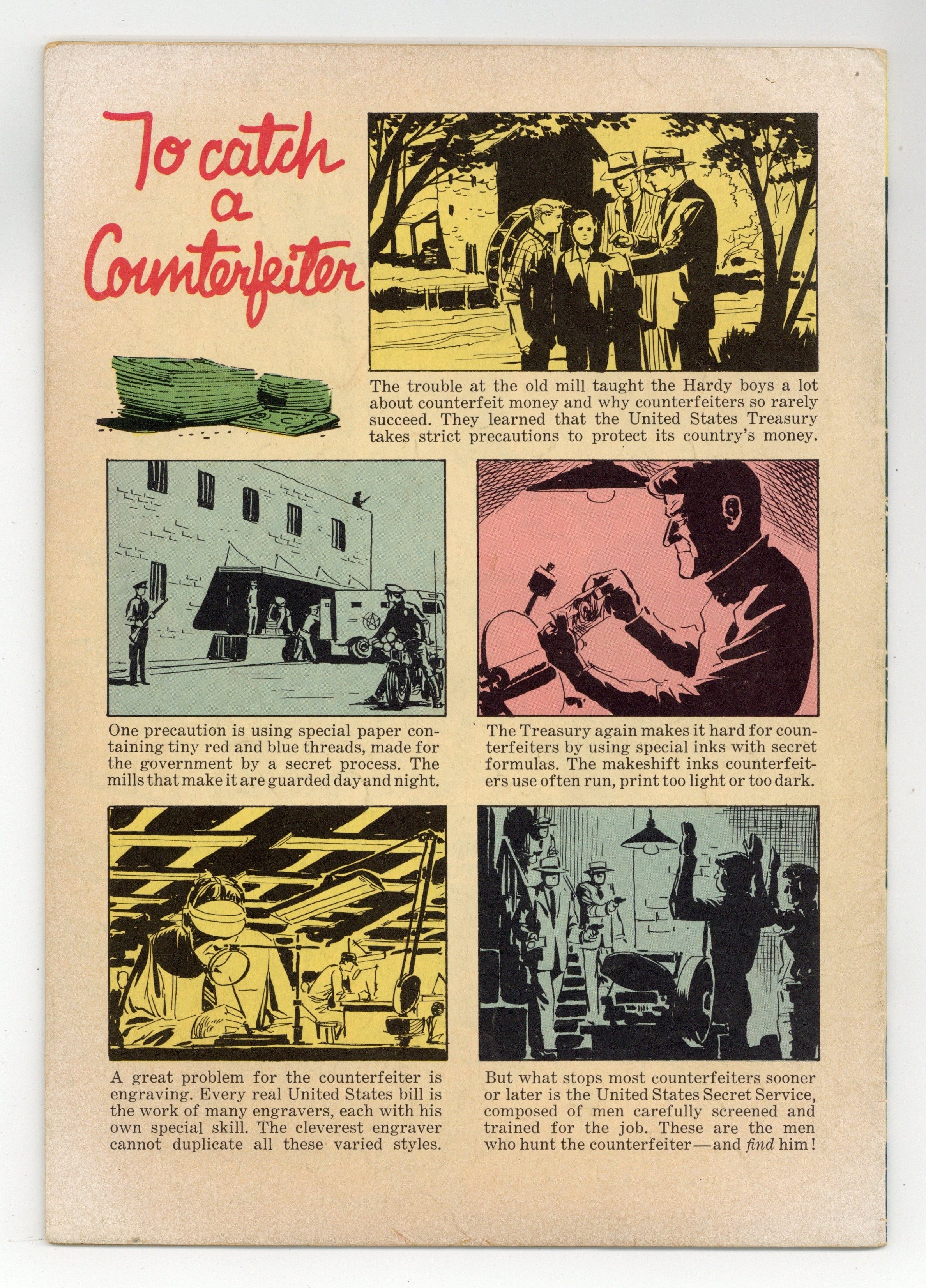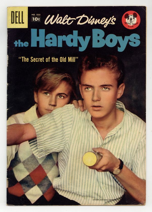 $15.2510c Cover Price Edition. "To Catch a Counterfeiter" filler on back cover. Walt Disney's The Hardy Boys in "The Secret of the Old Mill" - Written by unknown. Art by Dan Spiegle. Photo Cover shows Joe Hardy (as played by Tommy Kirk) and Frank Hardy (as played by Tim Considine). Based on the Hardy Boys serials that ran on The Mickey Mouse Club TV show in 1956-57. Second of four Hardy Boys Four Color issues. 36 pages, full color. Cover price $0.10.