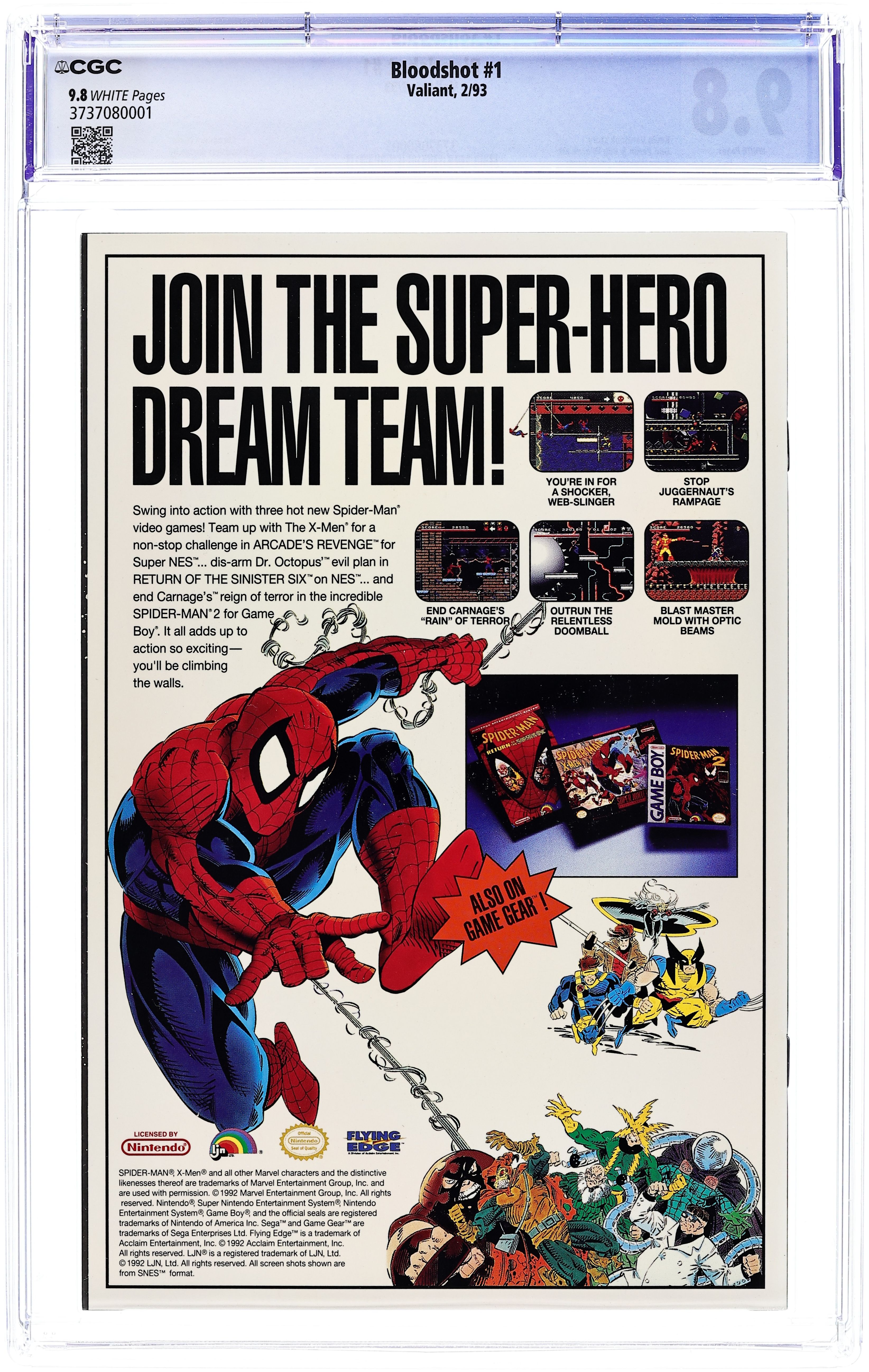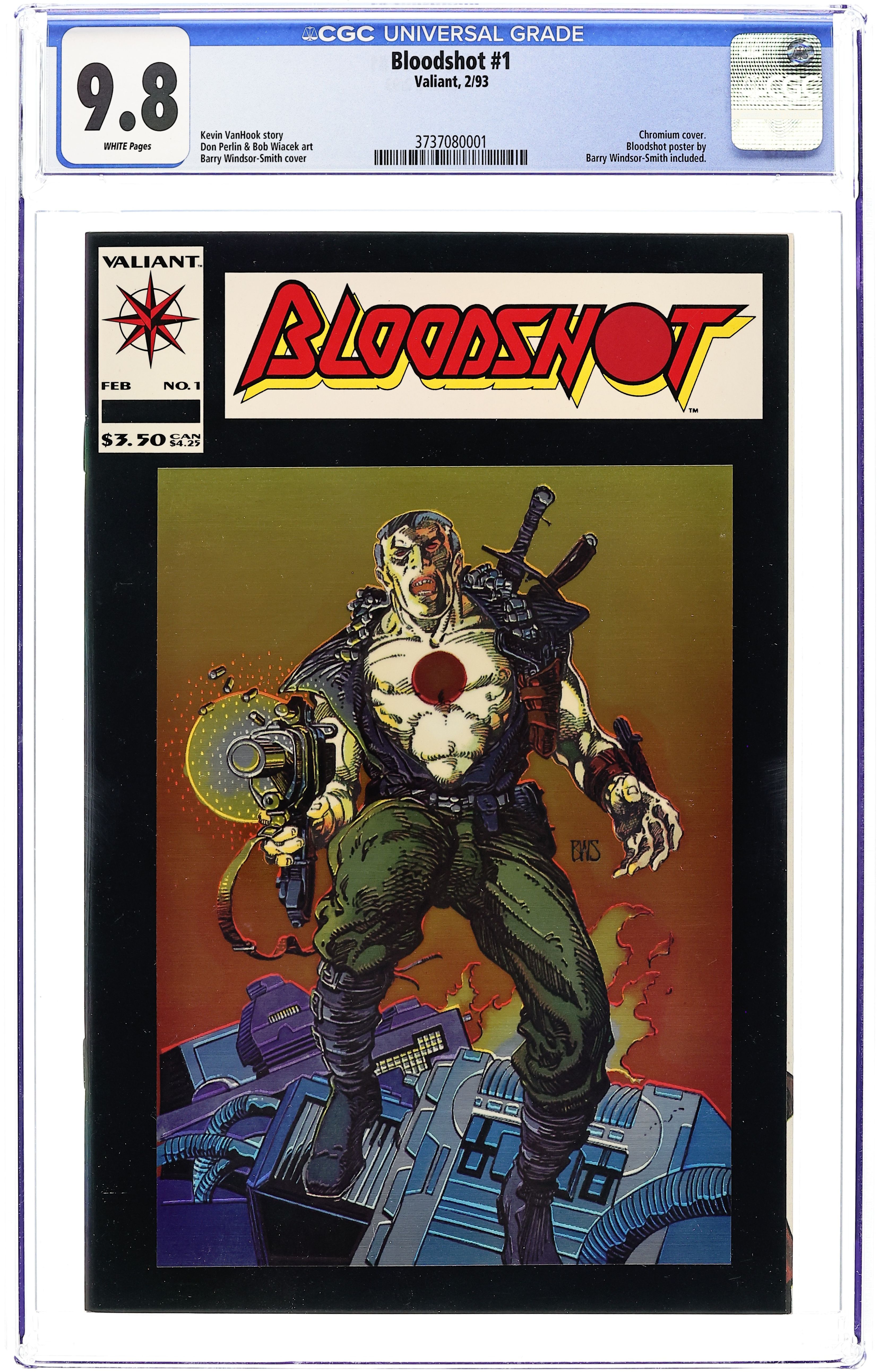Chrome cover. Cover by Barry Windsor-Smith. Blood of the Machine, script by Kevin VanHook, pencils by Don Perlin, inks by Bob Wiacek; A man with no name on the run from the mafia and the sinister Japanese conglomerate, Iwatsu Industries, Bloodshot will stop at nothing to learn the secret of his nanite-fueled second life. Geoff the Geomancer app. Bloodshot pull-out poster by Barry Windsor-Smith. 36 pgs., full color. $3.50. Cover price $3.50.