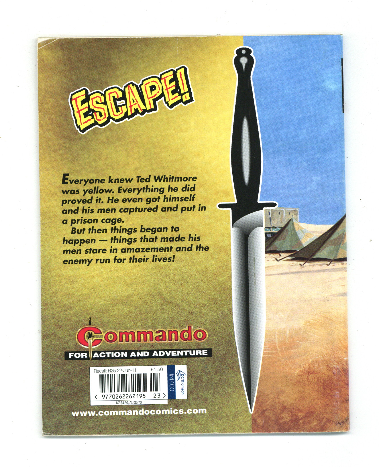 Reprinting Commando War Stories in Pictures (1961 D. C. Thomson Digest) #589: Escape! - Written by Cyril Walker. Art and Cover by Gordon Livingstone. Everyone knew Ted Whitmore was yellow. Everything he did proved it. He even got himself and his men captured and put in a prison cage. But then things began to happen -- things that made his men stare in amazement and the enemy run for their lives! Weekly British War comics digest. Softcover, 5 1/2-in. x 6 1/2-in., 68 pages, B&W.