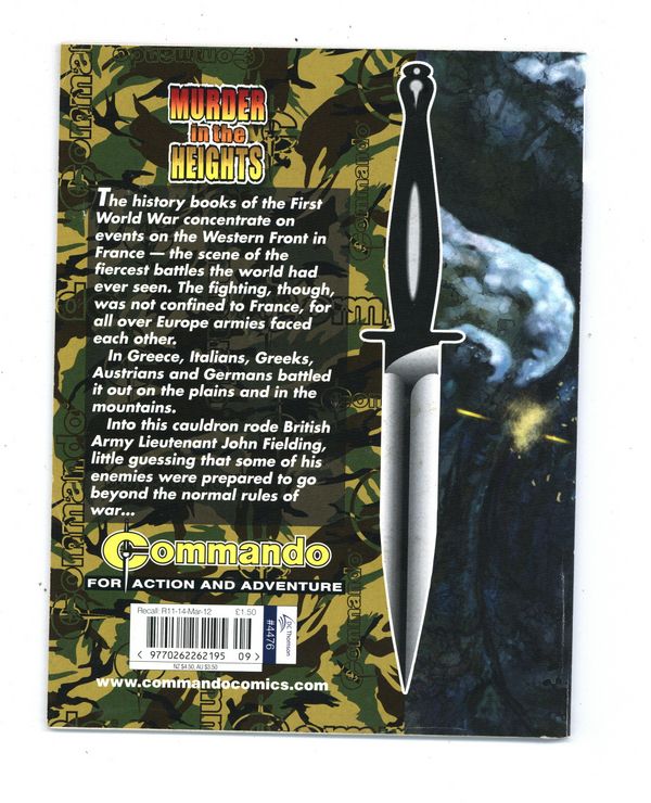 Published Mar 2012 by D. C. Thomson & Co..$8.00Murder in the Heights - Written by Alan Hebden. Art by Luis Olivera. Cover by Janek Matysiak. The history books of the First World War concentrate on events on the Western Front in France, the scene of the fiercest battles the world had ever seen. The fighting, though, was not confined to France, for all over Europe, armies faced each other. In Greece, Italians, Greeks, Austrians and Germans battled it out on the plains and in the mountains. Into this cauldron rode British Army Lieutenant John Fielding, little guessing that some of his enemies were prepared to go beyond the normal rules of war. Weekly British War comics digest. Softcover, 5 1/2-in. x 6 1/2-in., 68 pages, B&W.