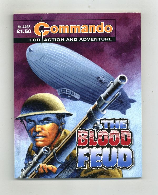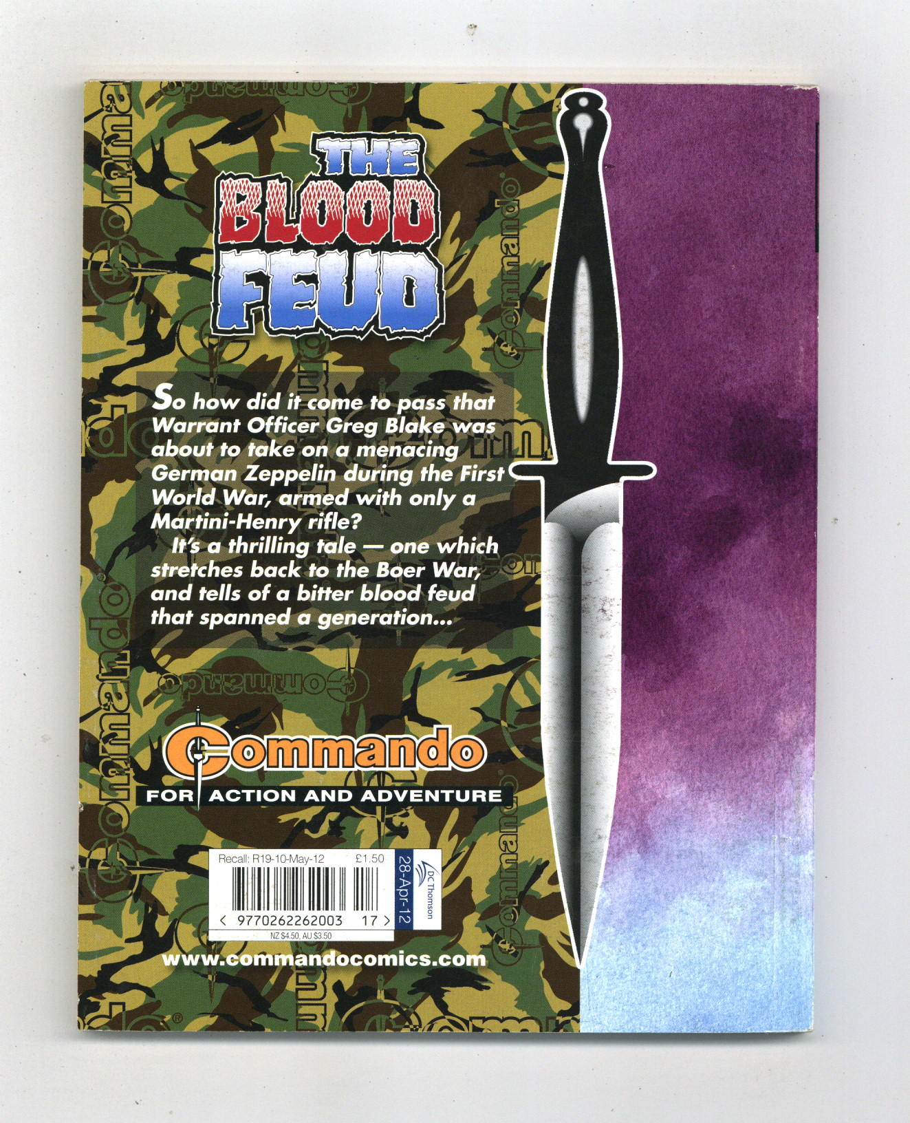 Published Apr 2012 by D. C. Thomson & Co..$24.00The Blood Feud - Written by Mac MacDonald. Art by Vila. Cover by Ian Kennedy. So how did it come to pass that Warrant Officer Greg Blake was about to take on a menacing German Zeppelin during the First World War, armed with only a Martini-Henry rifle? It's a thrilling tale -- one which stretches back to the Boer War, and tells of a bitter blood feud that spanned a generation. Weekly British War comics digest. Softcover, 5 1/2-in. x 6 1/2-in., 68 pages, B&W.