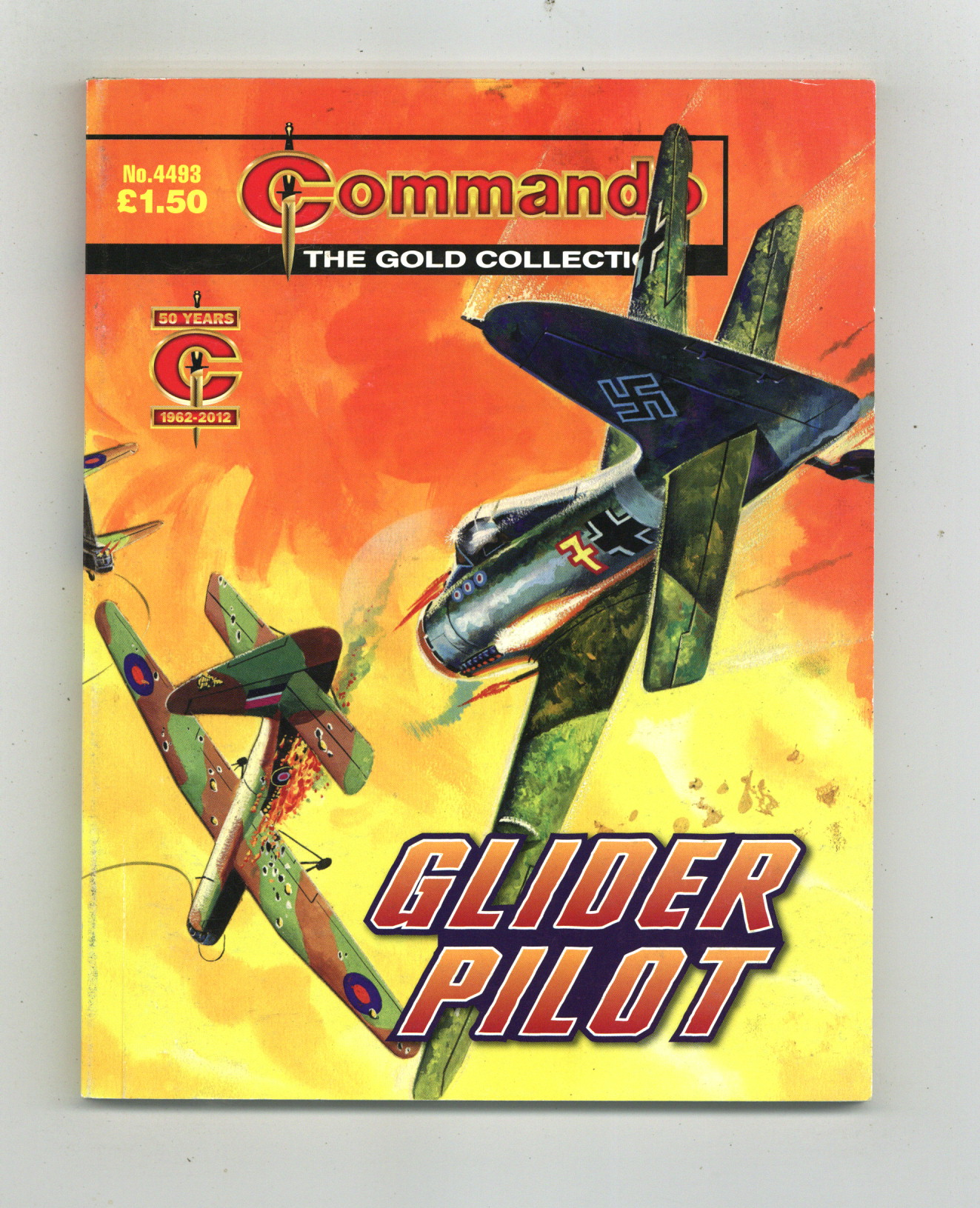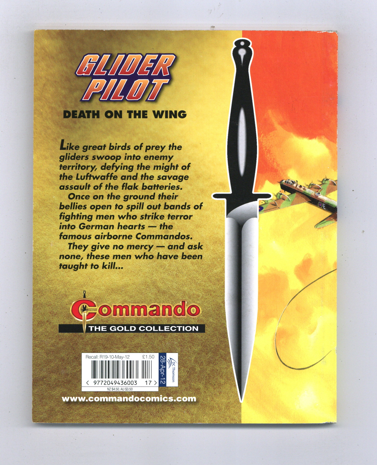 Published Apr 2012 by D. C. Thomson & Co..$6.00Reprinting Commando War Stories in Pictures (1961 D. C. Thomson Digest) #32: Glider Pilot - Written by Eric Hebden. Art by Armando Bonato. Cover by Ken Barr. Like great birds of prey, the gliders swoop into enemy territory, defying the might of the Luftwaffe and the savage assault of the flak batteries. Once on the ground, their bellies open to spill out bands of fighting men who strike terror into German hearts -- the famous airborne Commandos. They give no mercy and ask none, these men who have been taught to kill. Weekly British War comics digest. Softcover, 5 1/2-in. x 6 1/2-in., 68 pages, B&W.