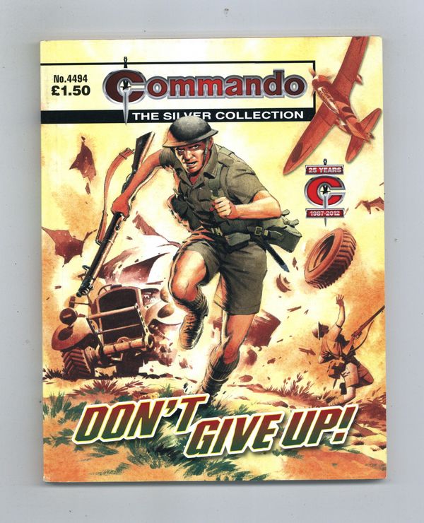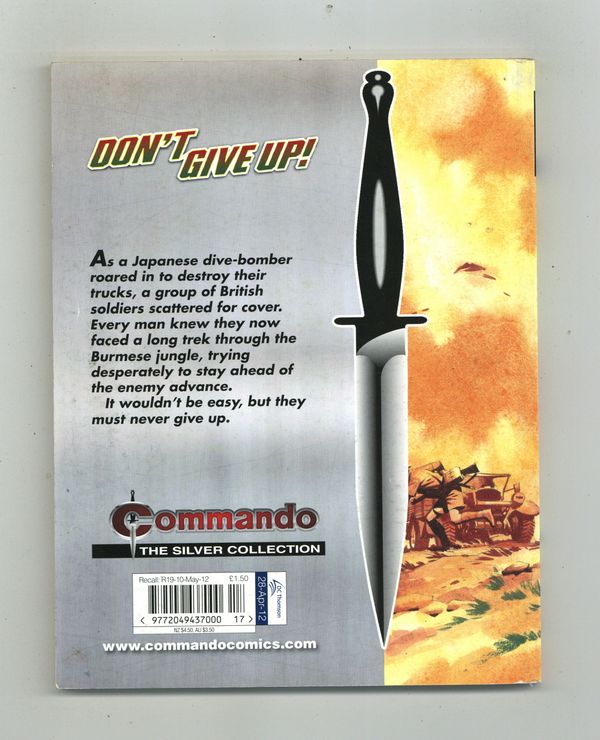 Reprinting Commando War Stories in Pictures (1961 D. C. Thomson Digest) #2105: Don't Give Up! - Written by R.A. Montague. Art by C.T. Rigby. Cover by Ian Kennedy. As a Japanese dive-bomber roared in to destroy their trucks, a group of British soldiers scattered for cover. Every man knew they now faced a long trek through the Burmese jungle, trying desperately to stay ahead of the enemy advance. It wouldn't be easy...buy they must never give up. Weekly British War comics digest. Softcover, 5 1/2-in. x 6 1/2-in., 68 pages, B&W.